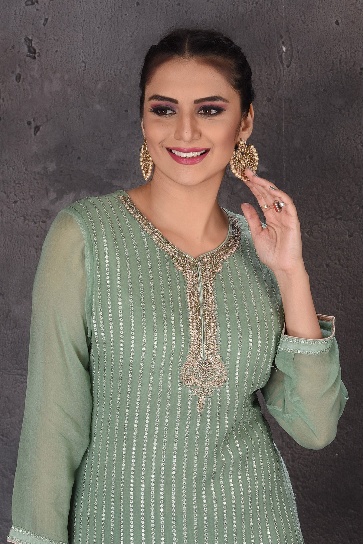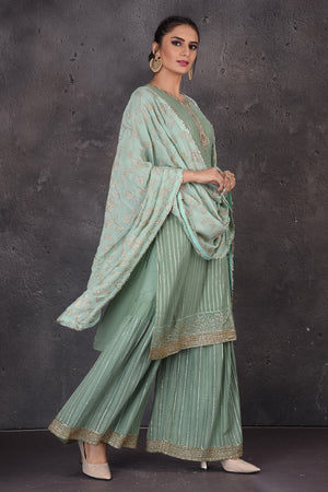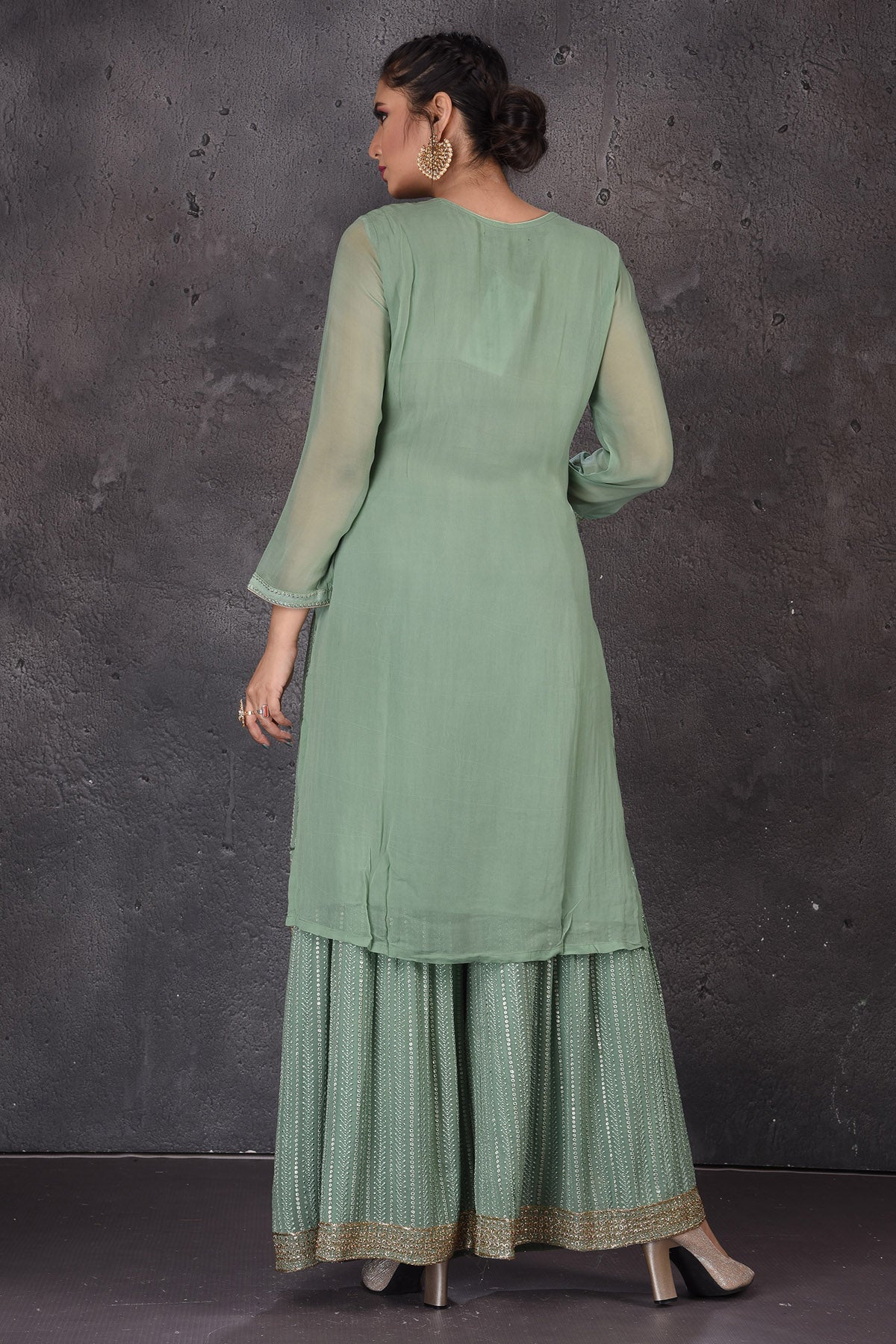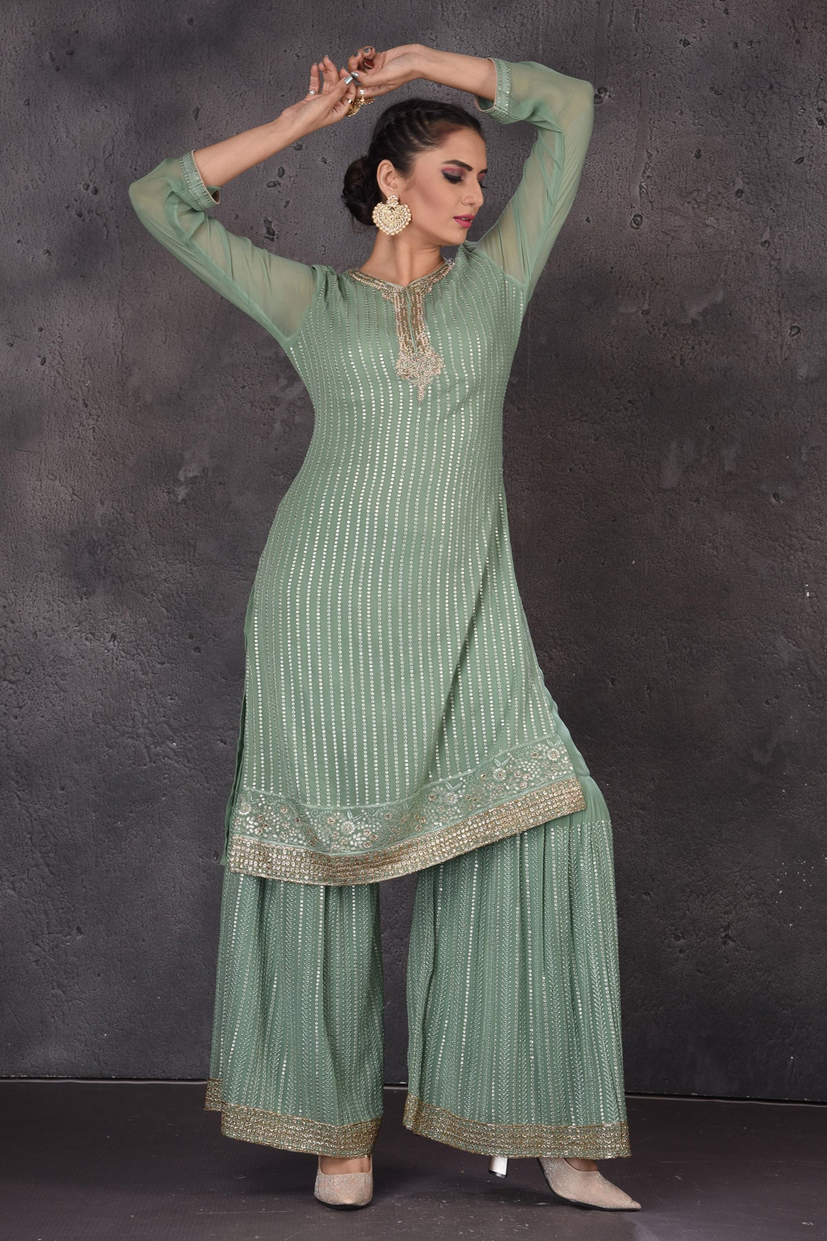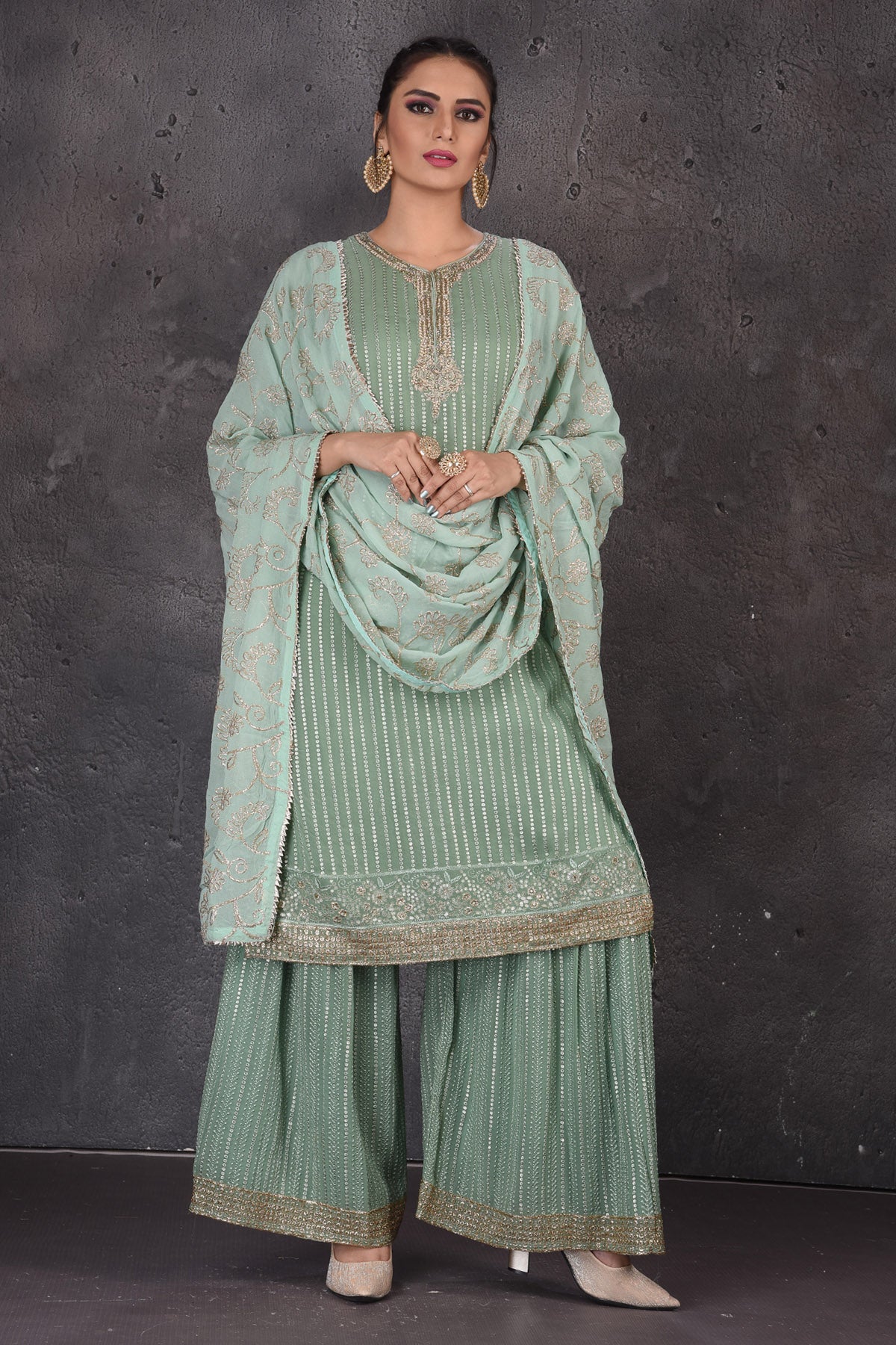 Look elegant on festive occasions in this stunning green embroidered sharara suit with dupatta. Shop designer suits in USA from Pure Elegance.