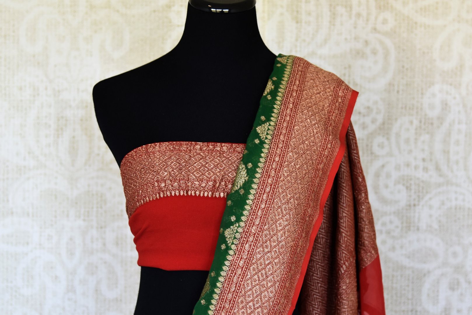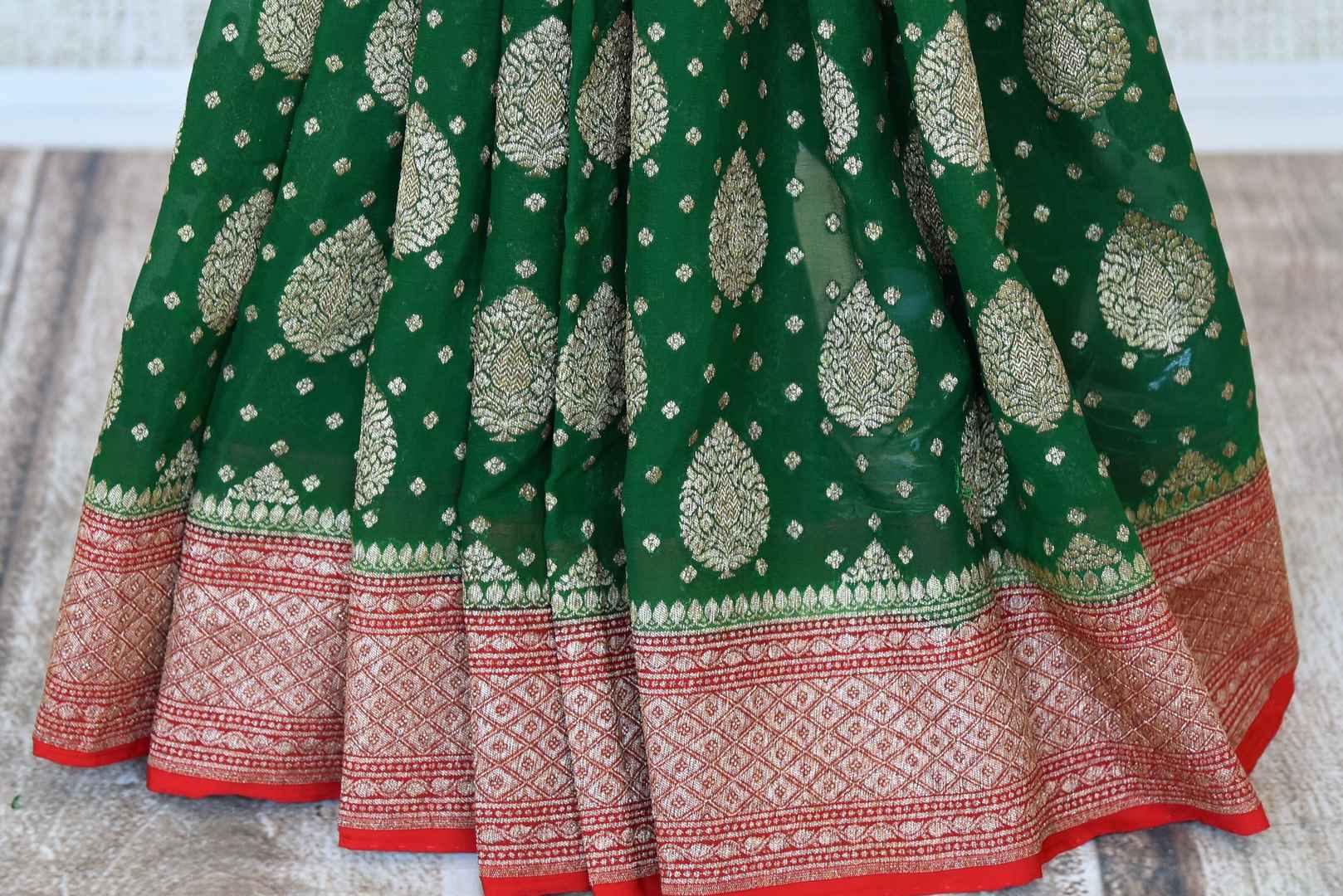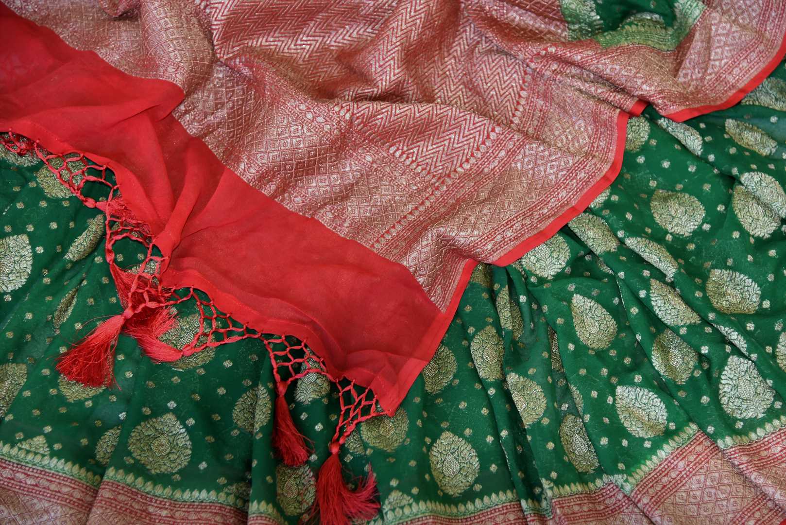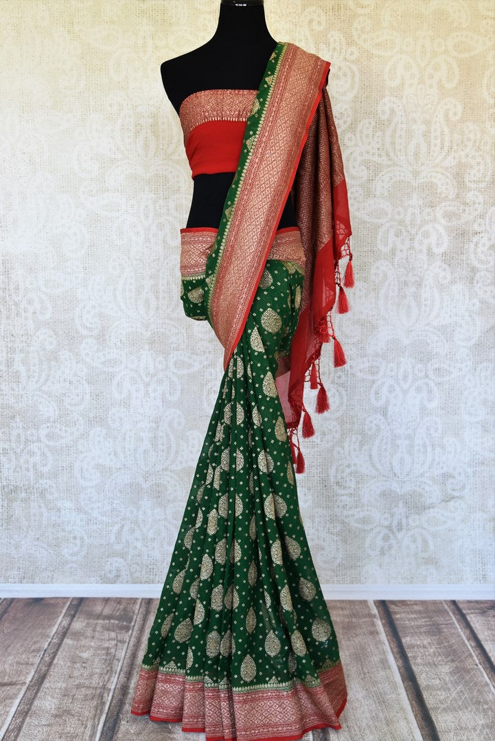 Striking green color georgette Banarasi sari for weddings and special occasions! The saree is crafted with zari leaf buta throughout and has a contrasting red zari border and pallu. It comes with a red blouse piece. Buy online from Pure Elegance or visit our store in USA.