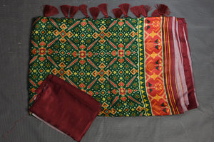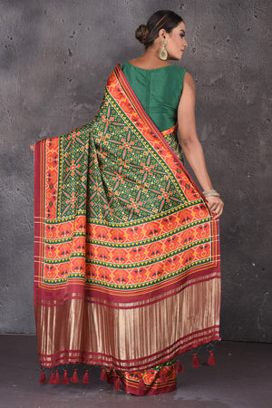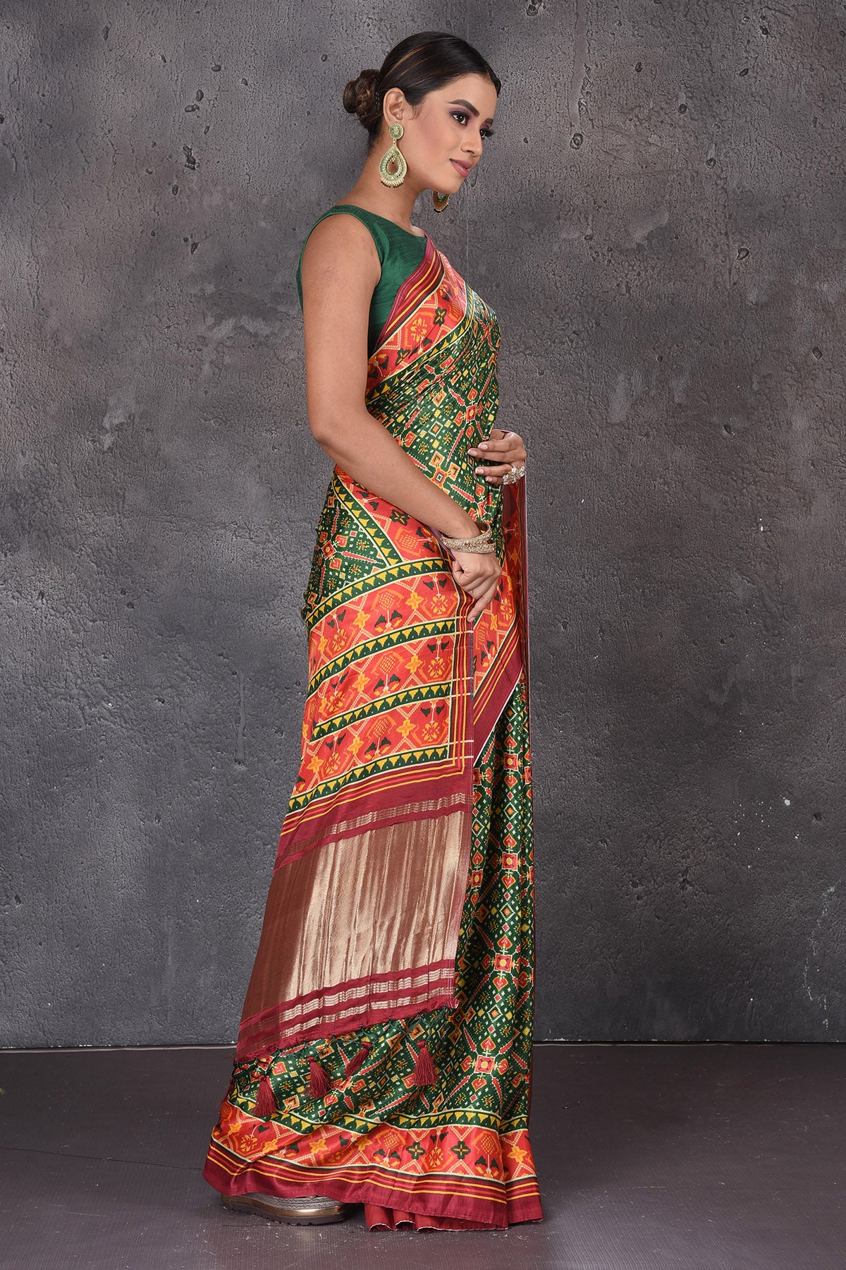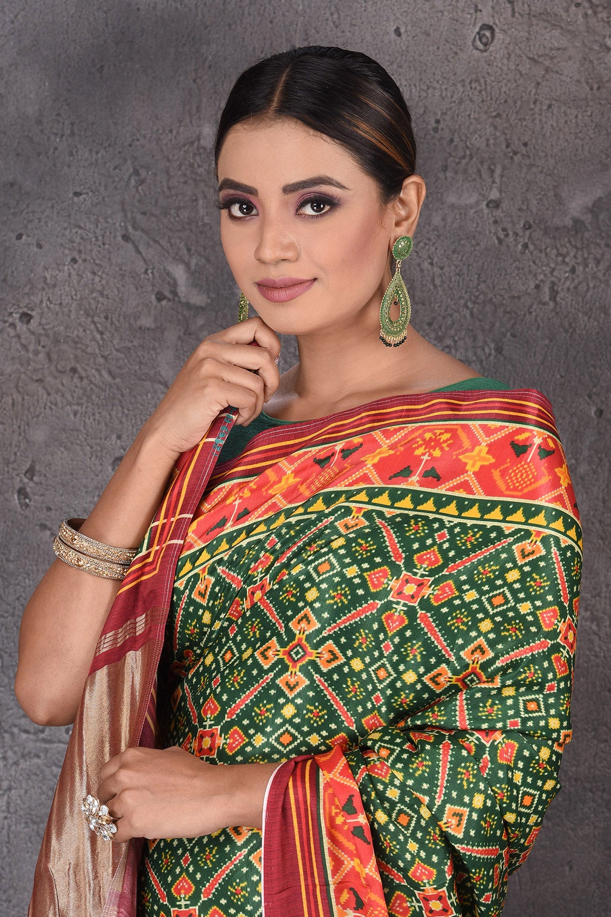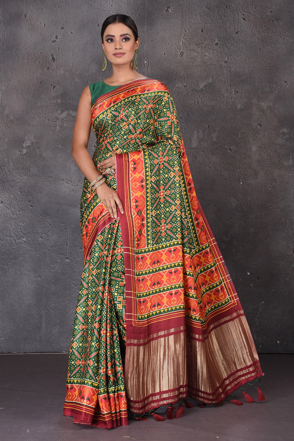 Flaunt ethnic look on festive occasions in this gorgeous green crepe silk printed saree with zari pallu. It comes with a matching blouse piece. Shop silk arees in USA from Pure Elegance.