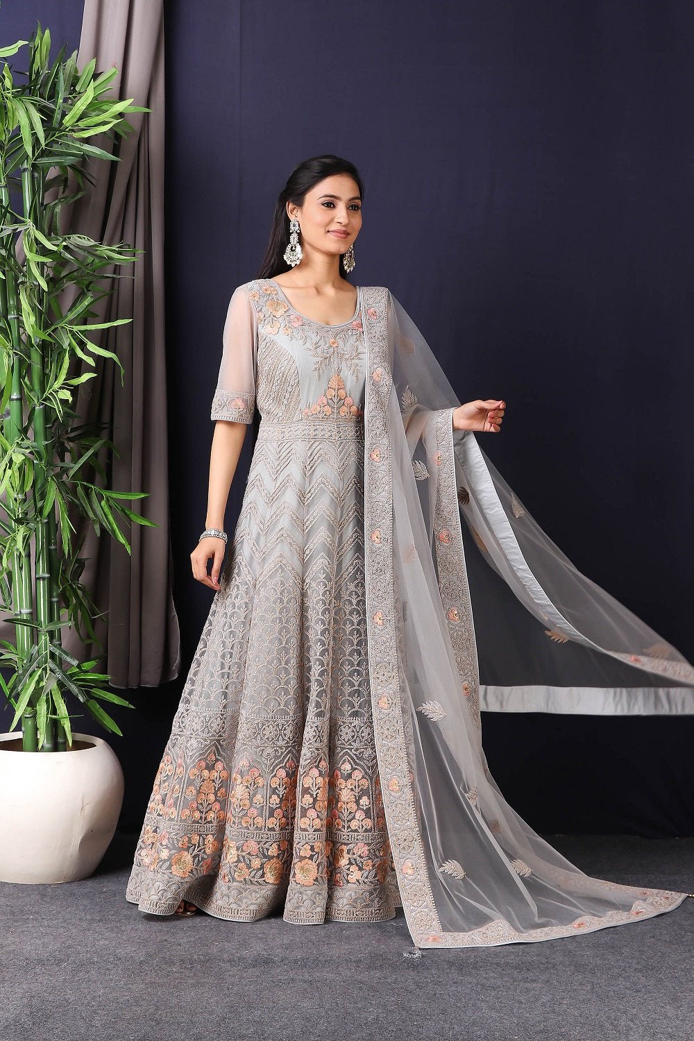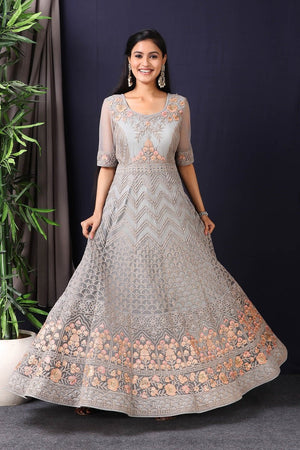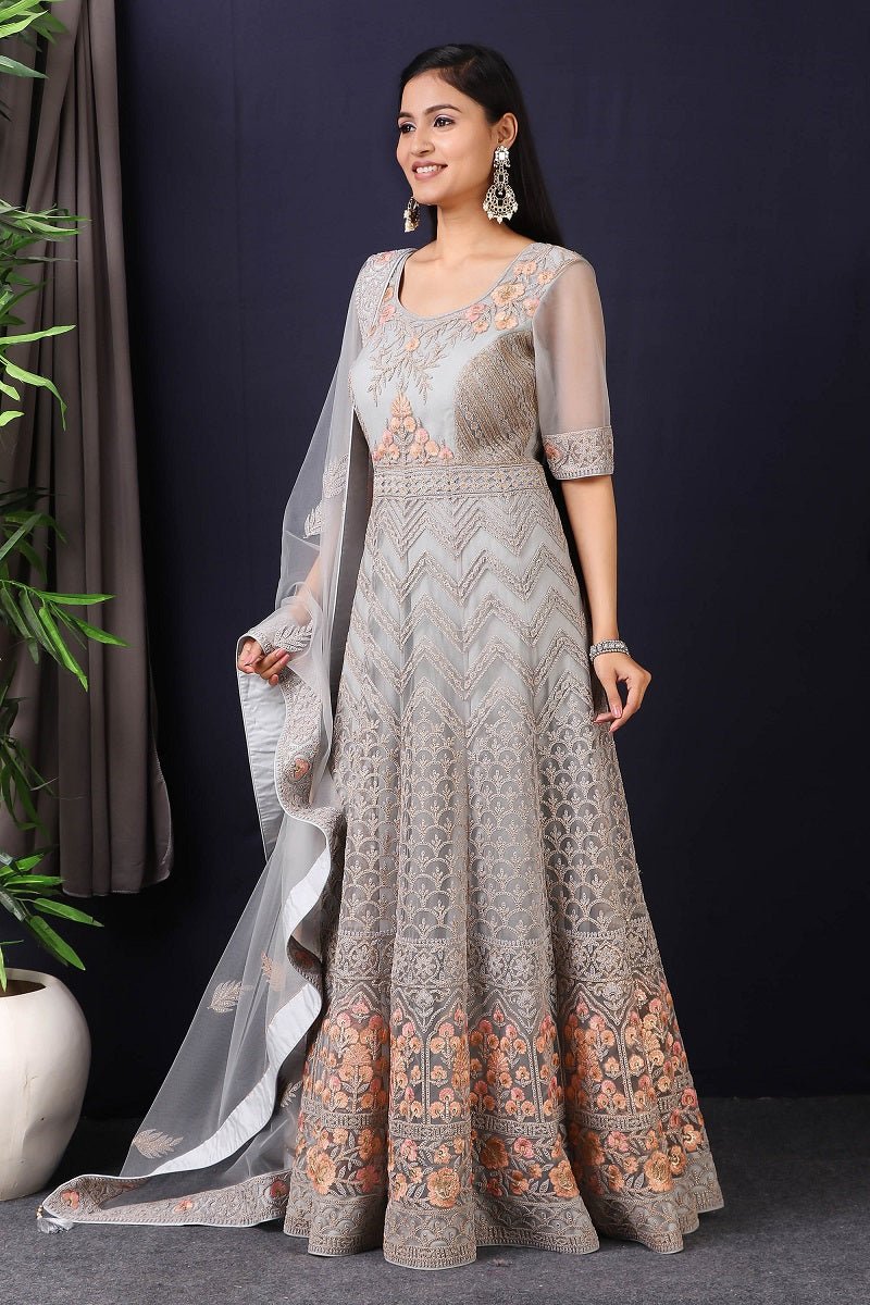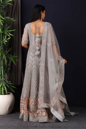Add vibrant grace and colors to your festive wardrobe with this designer grey embroidered net anarkali with skirt with lace work on it. A fully embroidery work on anarkali suit with heacy dupatta makes this a sophisticated piece of luxury that will captivate you in its calmness and serenity. Style this set with a pair of diamond earrings and solid pumps to finish the look from Pure Elegance.