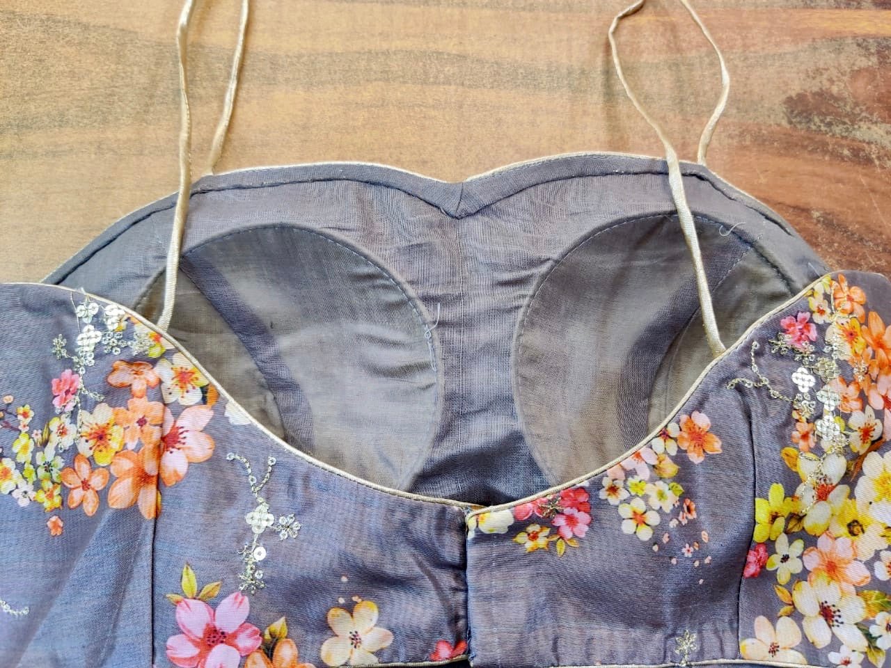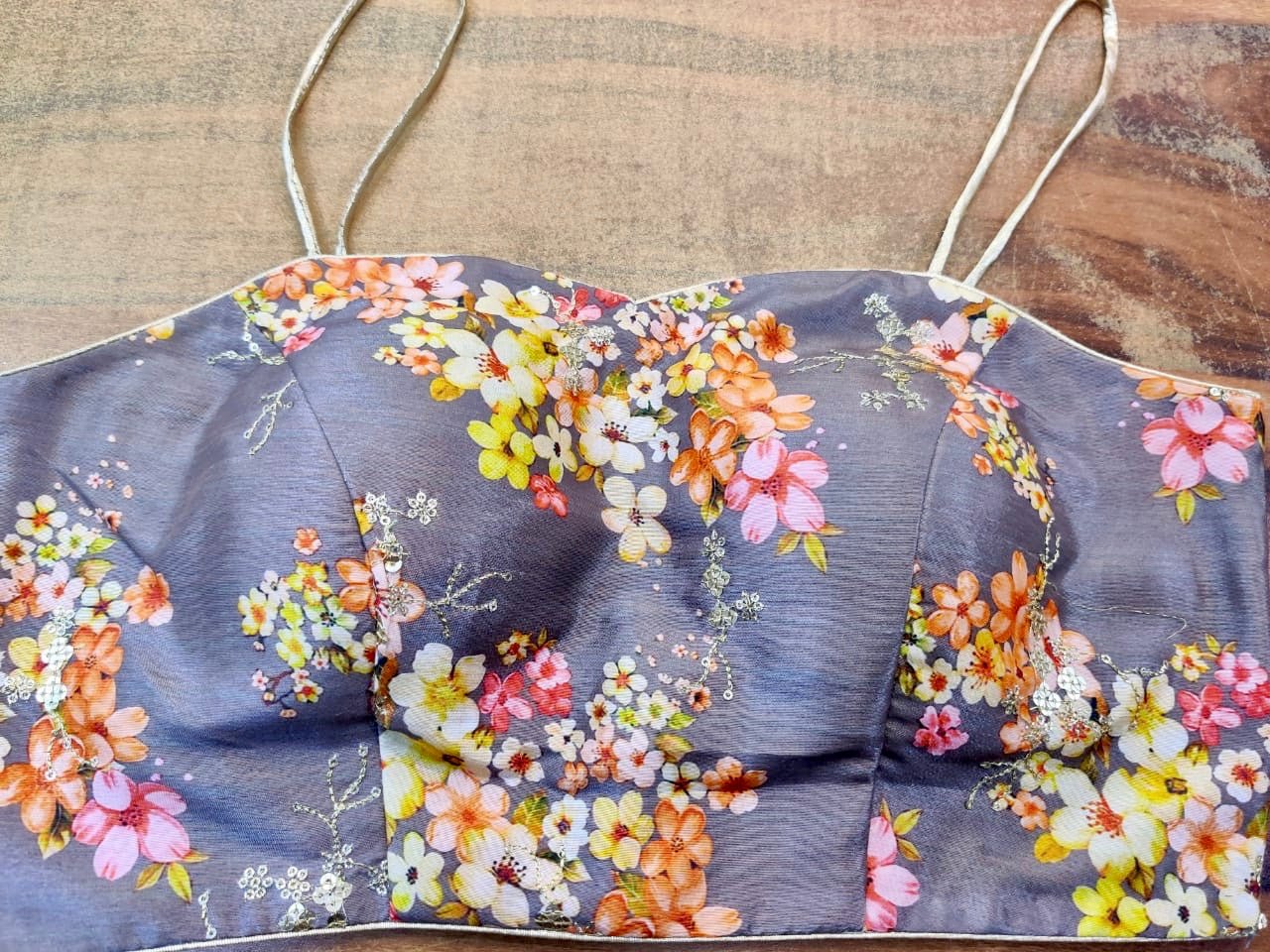 Ethnic modern grey floral embroidered organza saree blouse. Buy online from Pure Elegance.