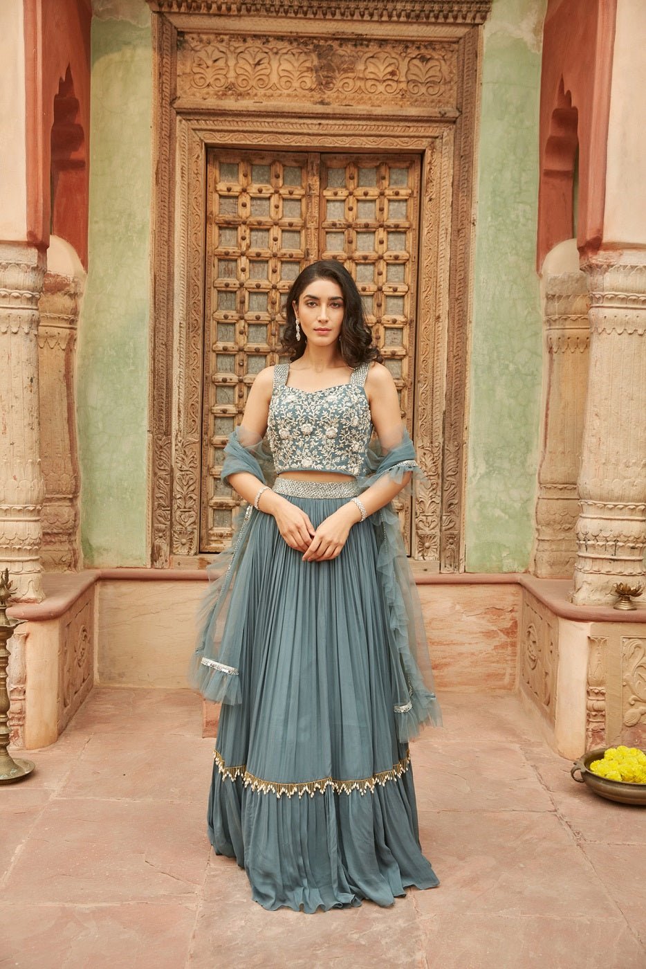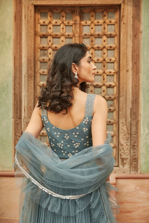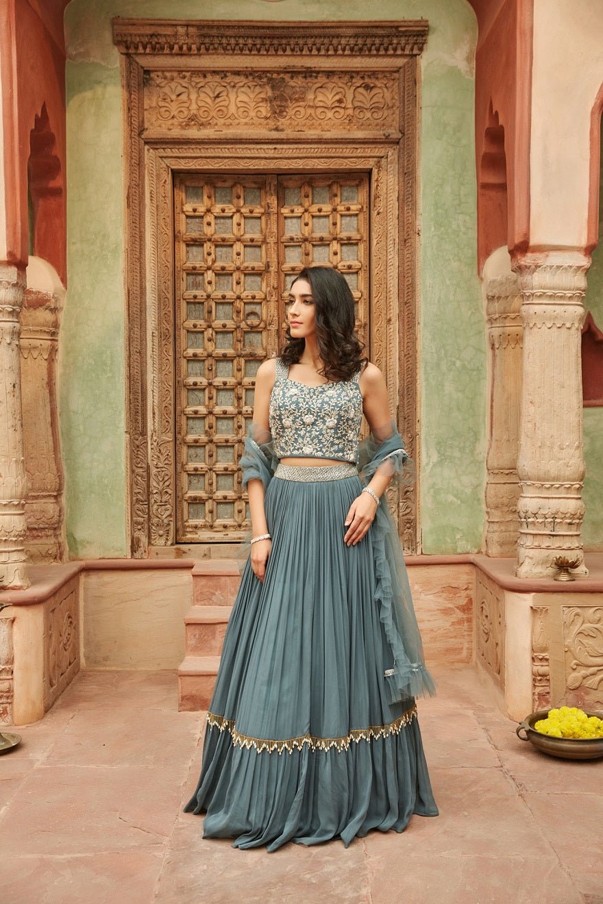 Beautiful sea green embroidered chinon lehenga with dupatta. The lehenga is a perfect choice for weddings, sangeet and mehendi. Buy online from Pure Elegance