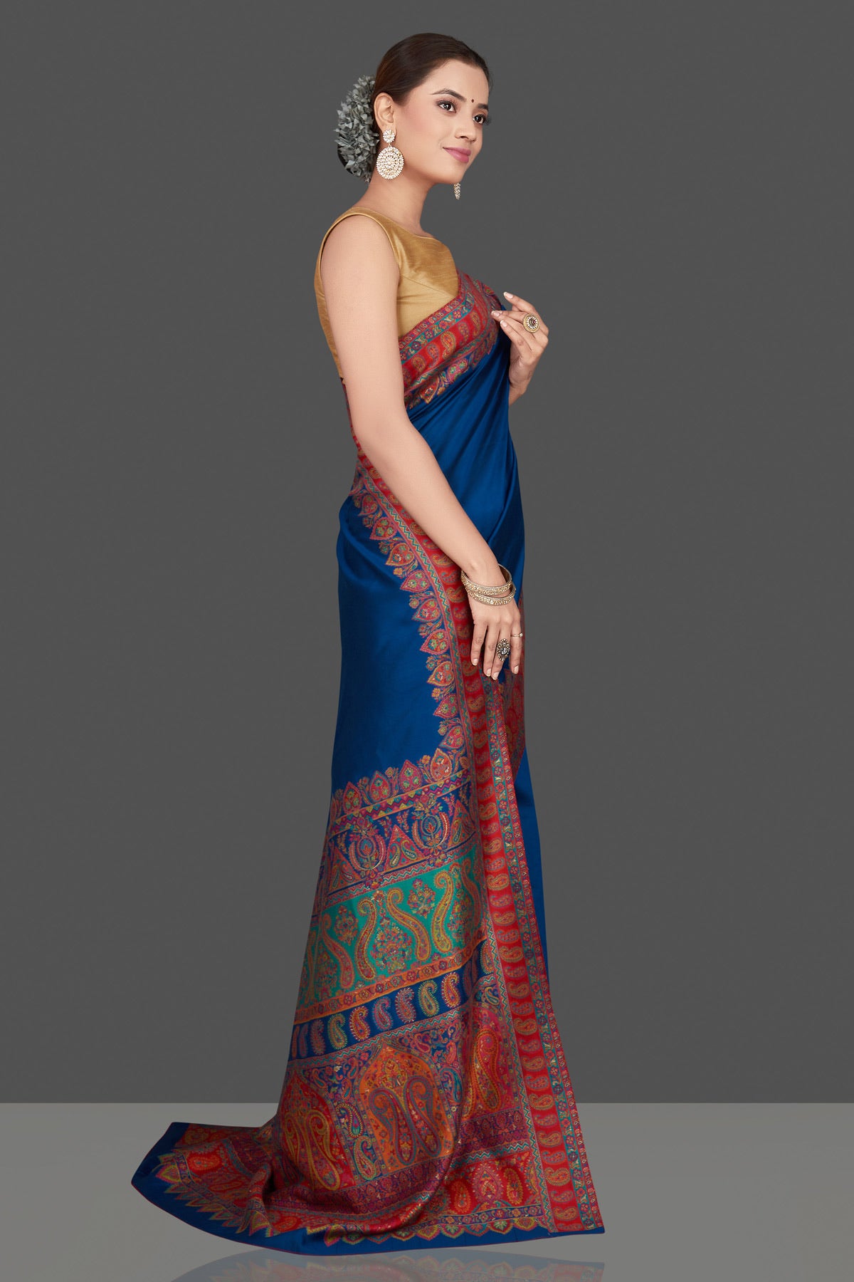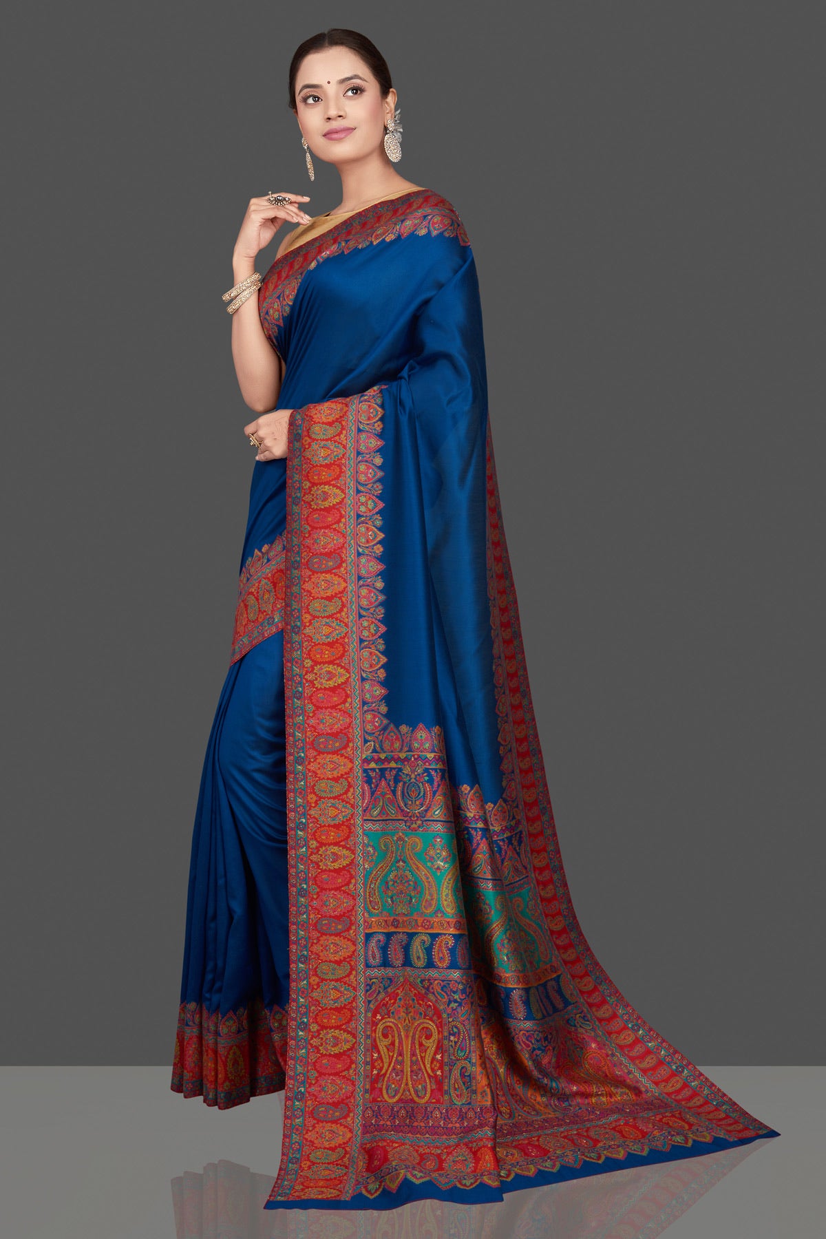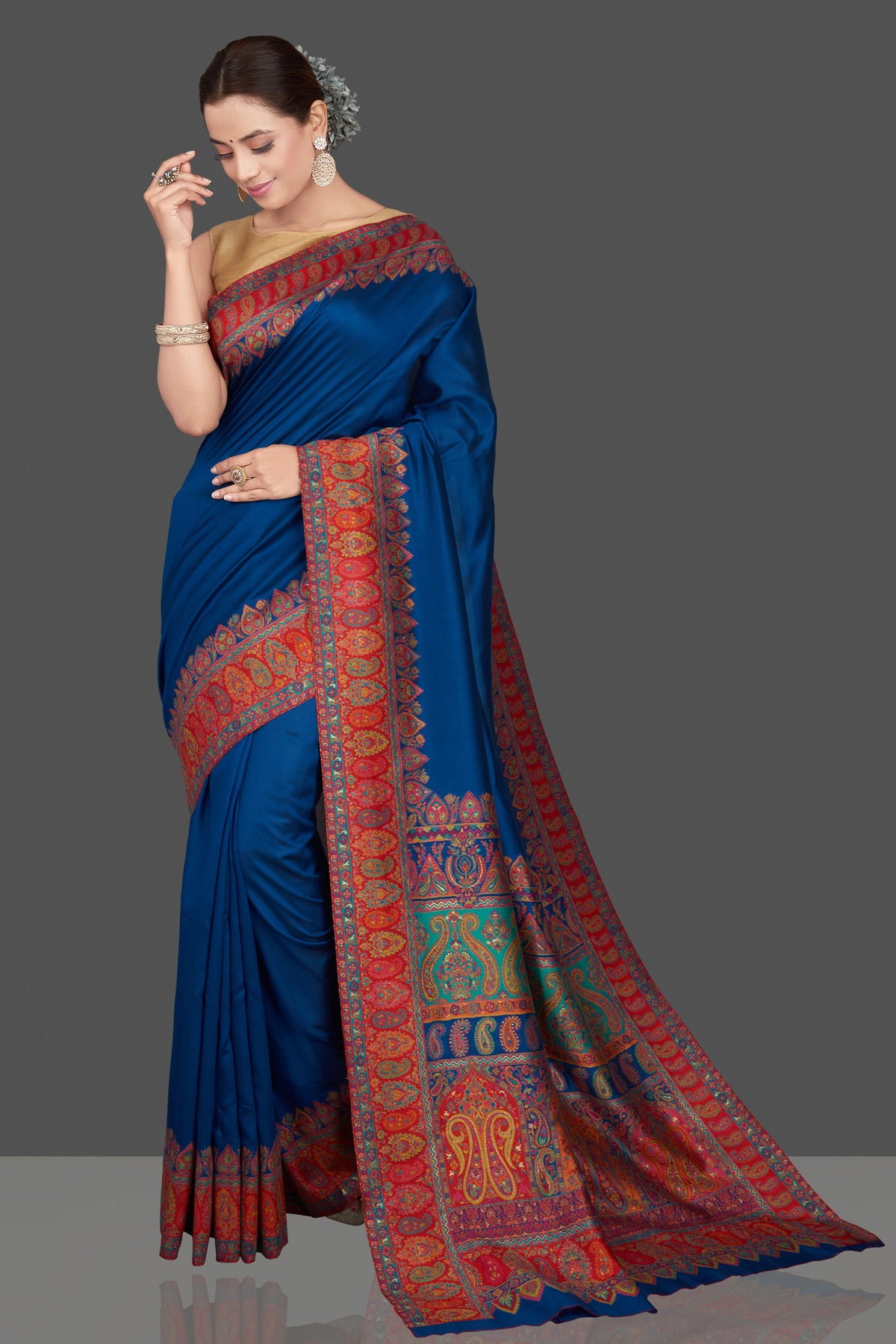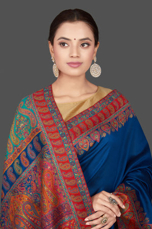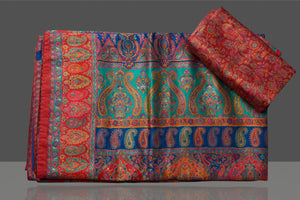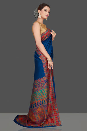 Gorgeous blue multiprint silk saree is a stunning choice for festivals and pre-wedding occasions! It is enhanced with Kani embroidery and comes with a pink blouse piece. Shop silk sarees in USA from Pure Elegance.