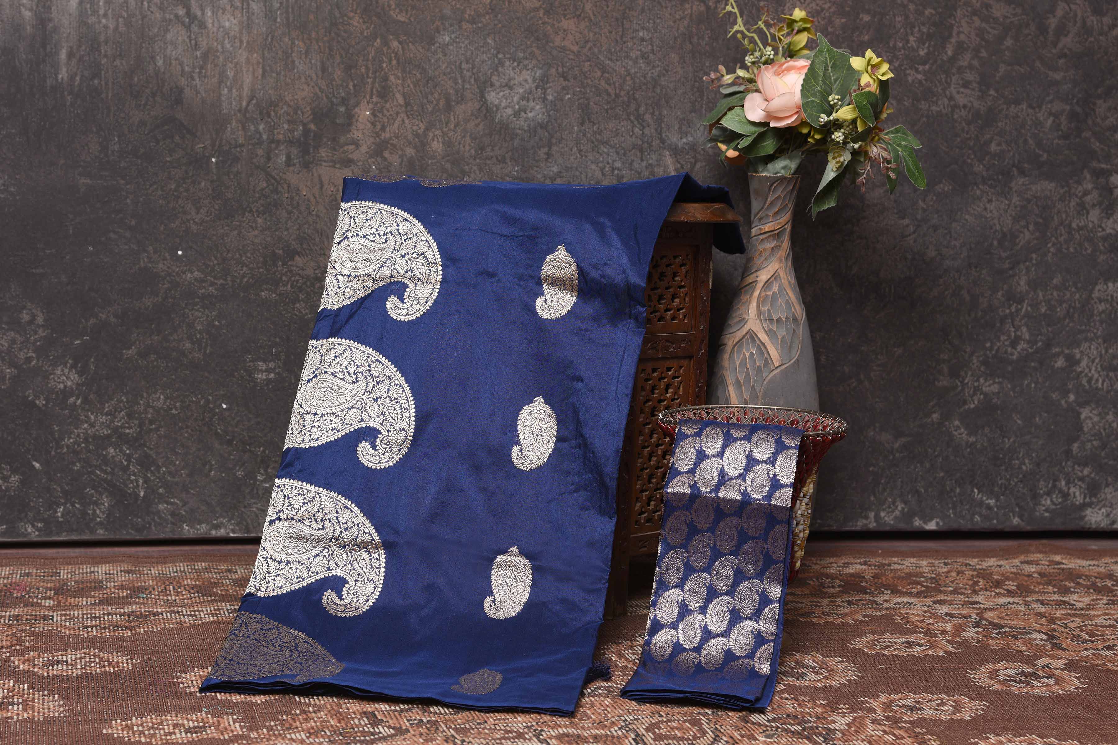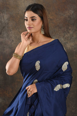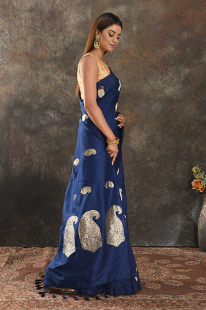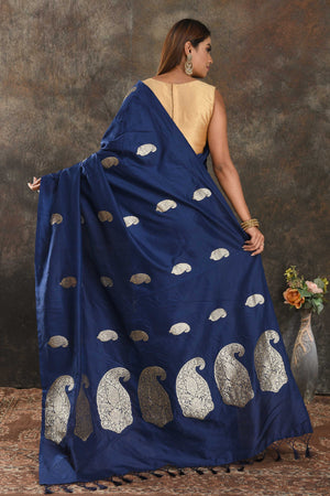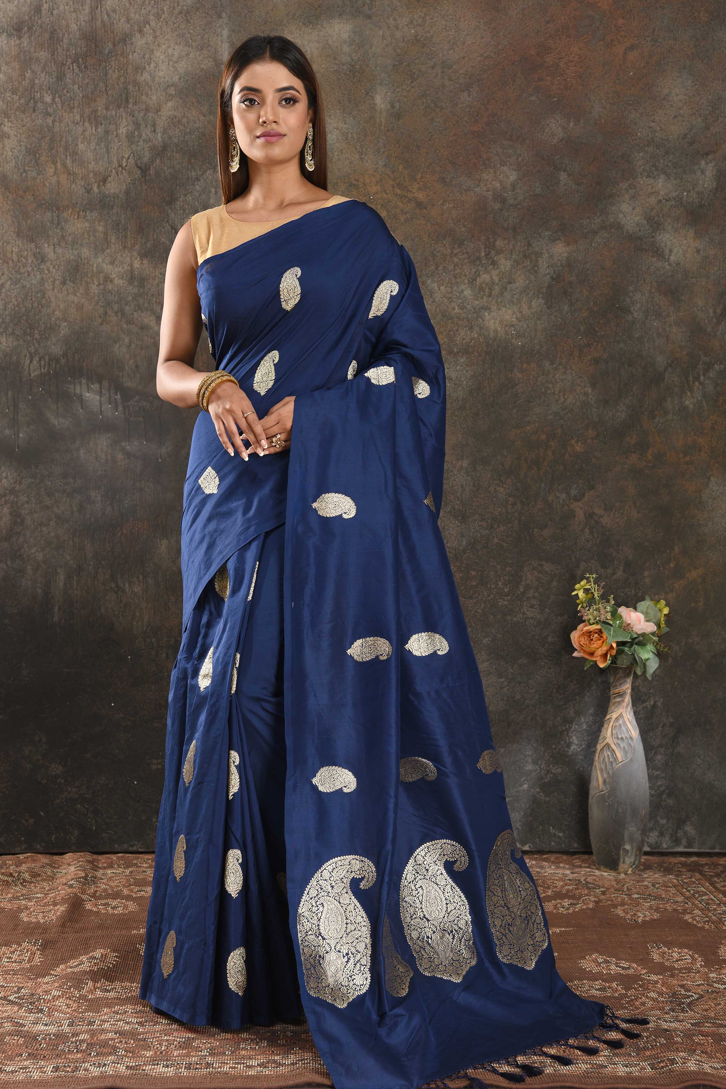 Be vision of elegance on special occasions in this beautiful indigo blue silk sari. The saree is enhanced with silver zari paisley buta and pallu. It comes with a matching blouse piece.