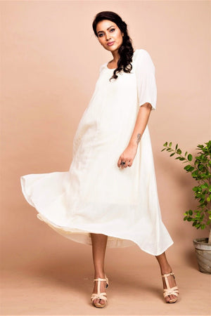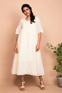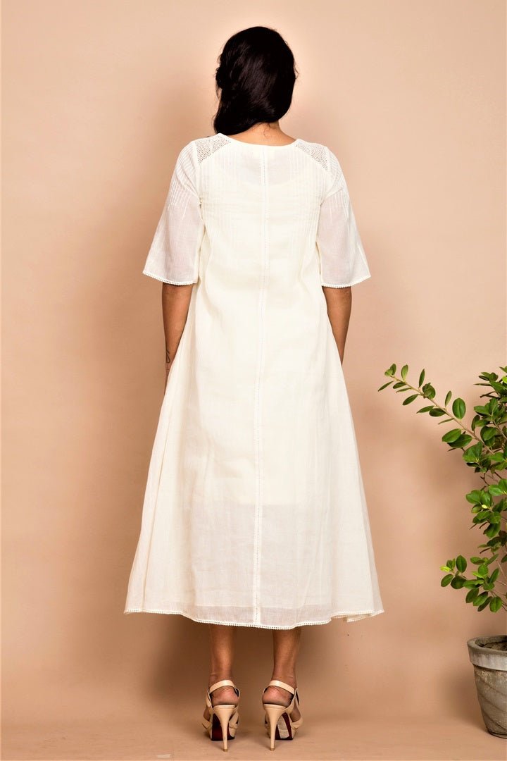 Twirl in beautiful summer weather wearing this refreshing ivory A-line cotton tunic dress. The dress has pintucks details on the bodice and is embellished with shoulder lace panel and dress hemline. It comes with a short inner.