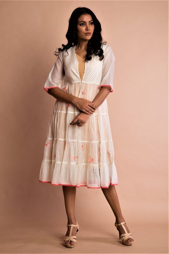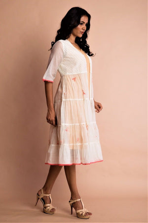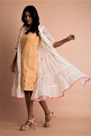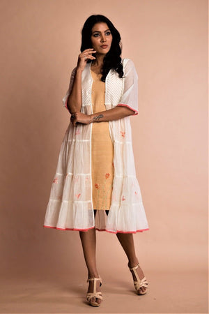 Cut a striking picture in this chic ivory color layered frilled jacket in 100% fine mercerized cotton on frills and sleeves and cotton Jamdani on the bodice! The jacket is hand embroidered and is embellished with handmade buttons and loops and has lace detailing. Shop online at Pure Elegance or visit our store in USA!