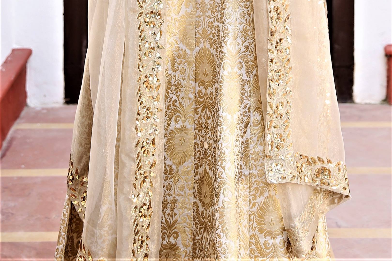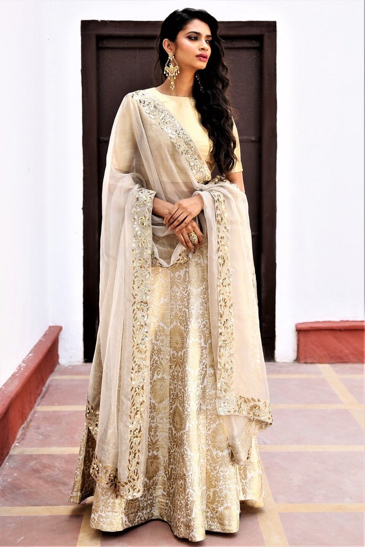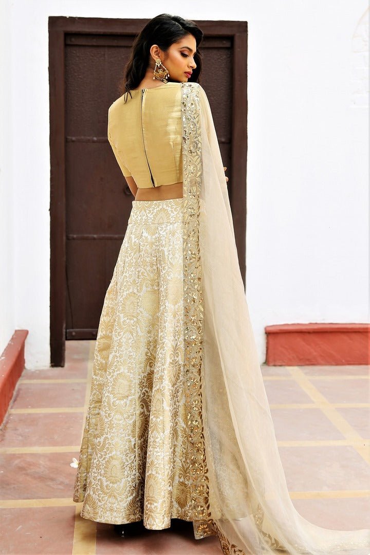 Strike the right style notes with this off-white high waisted zari brocade lehenga with gold zari blouse on wedding occasions.The dupatta is crafted in tissue net with zardozi pitta work. Shop online at Pure Elegance or visit our store in USA.