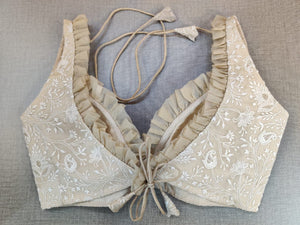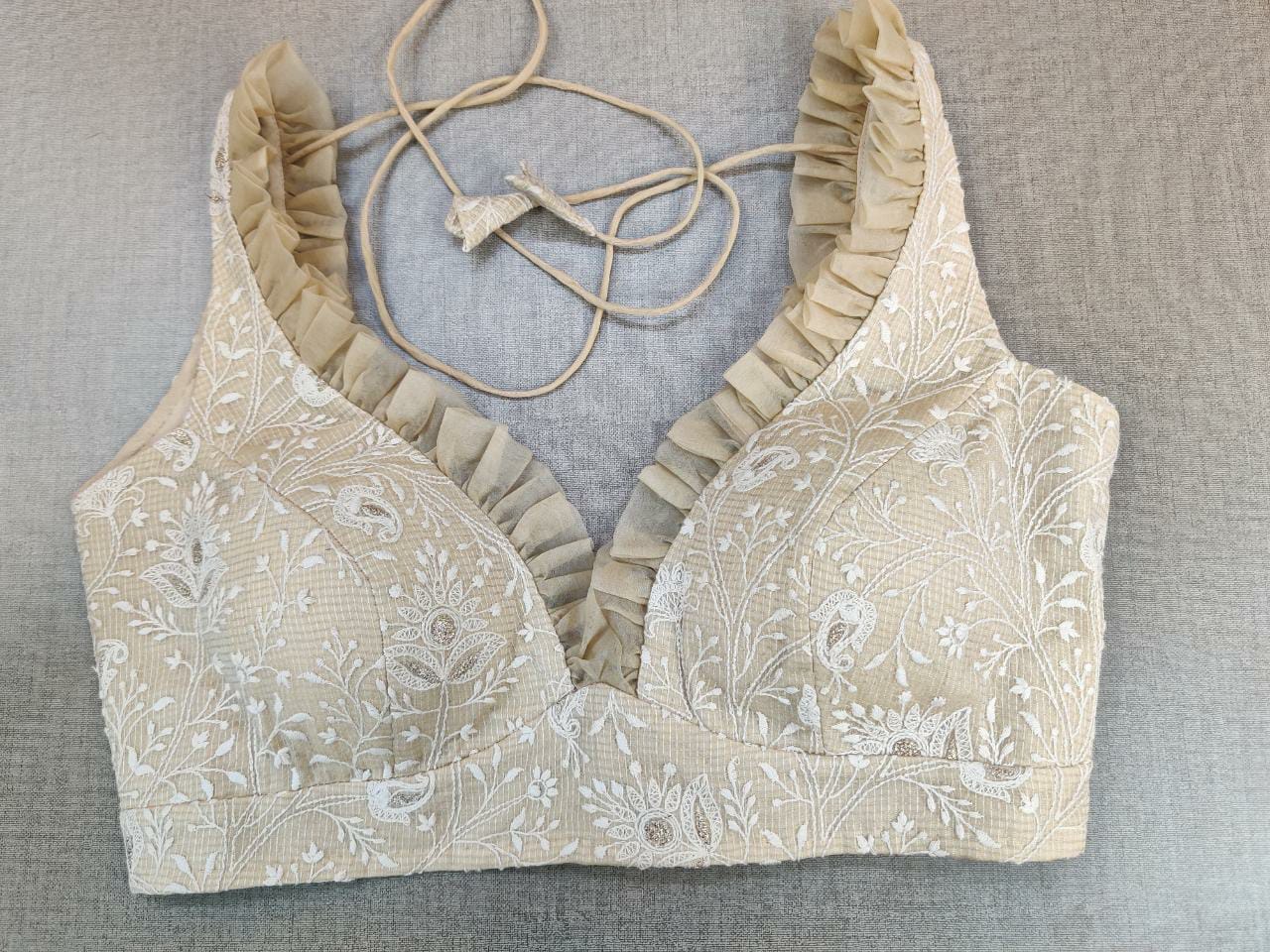 Beautiful light beige Lucknowi work sleeveless saree blouse. Buy designer blouse in USA from Pure Elegance.