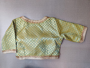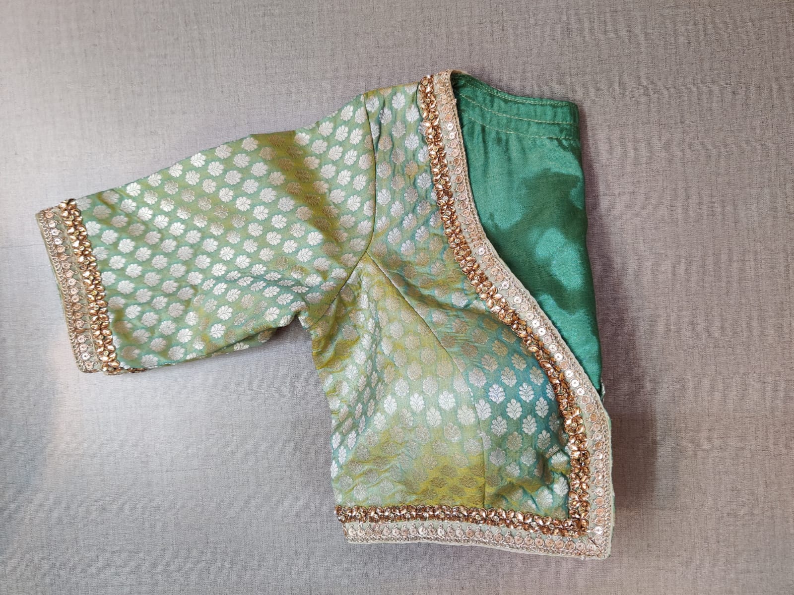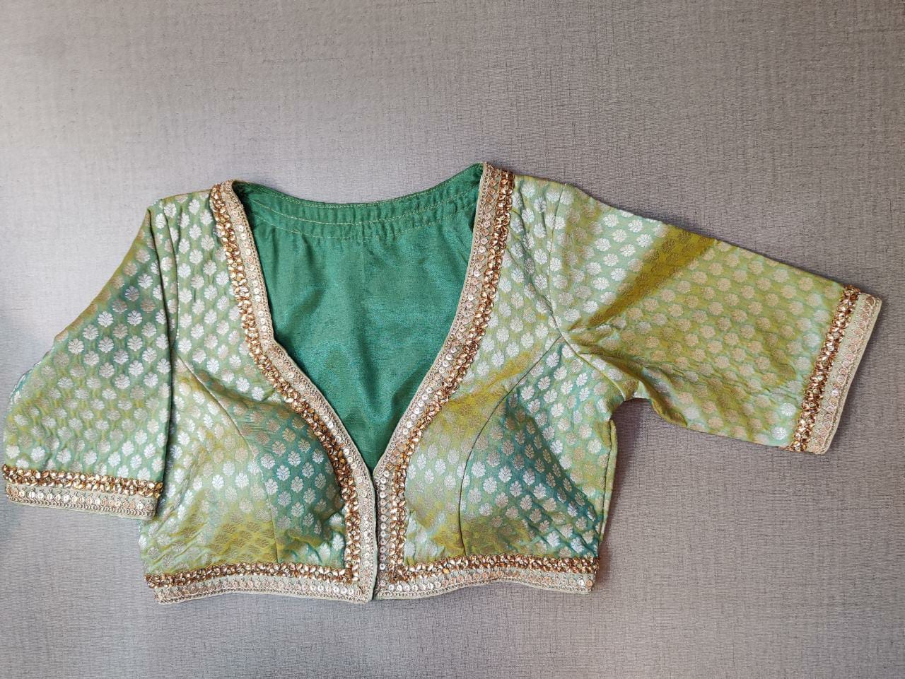 Beautiful light green embroidered Banarasi saree blouse. Buy designer blouse in USA from Pure Elegance.