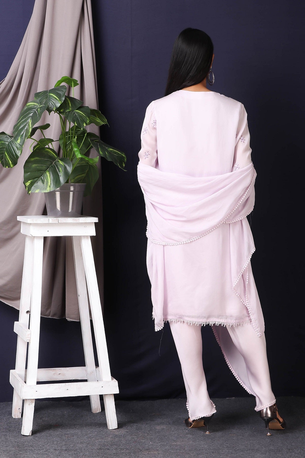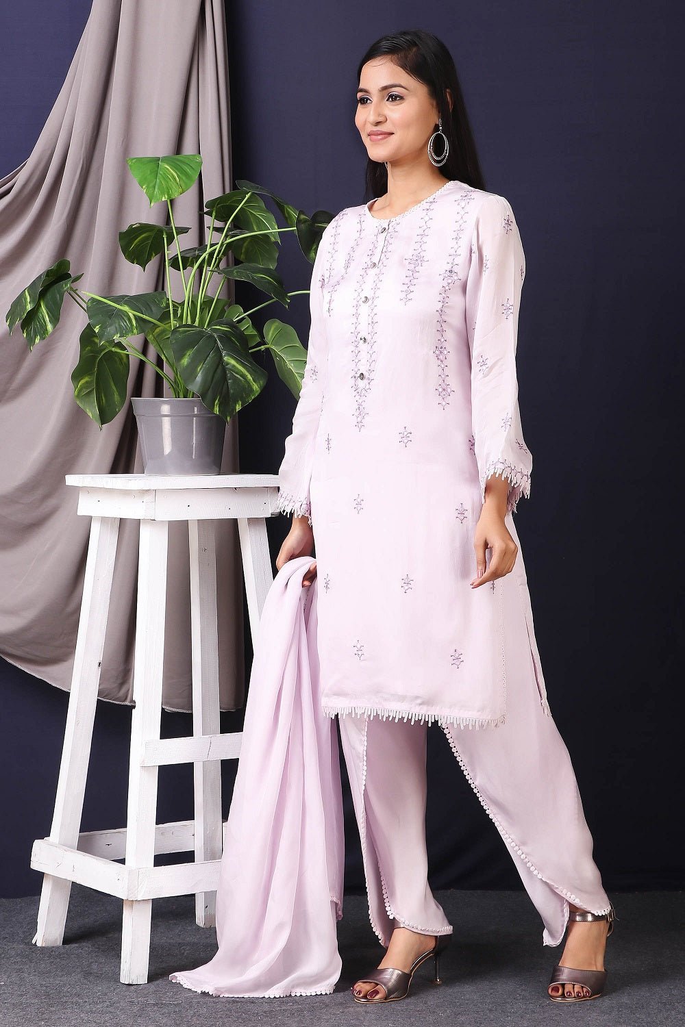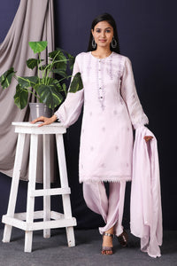 Stand out with this gorgeous lilac satin organza pakistani cut suit with crepe dhoti and stole in a breezy and delicate cream tone featuring mirror work with lace edging all over. This beautiful satin organza material outfit showcases beautiful sleeves with lace work on it offering a comfortable fit, making this outfit an absolute head-turner at parties. Style this set of suit with a pair of diamond earrings and solid pumps to finish the look from Pure Elegance.