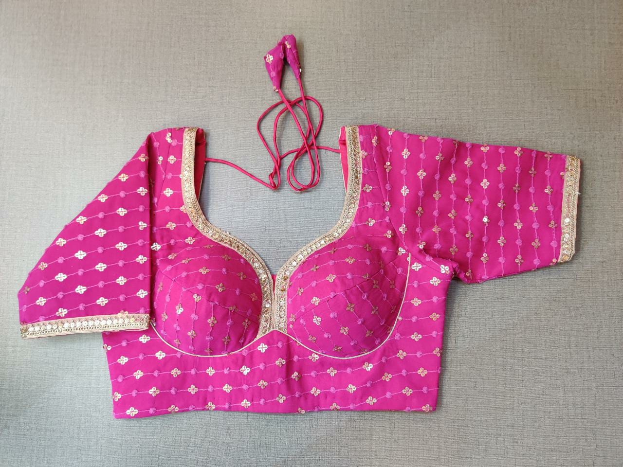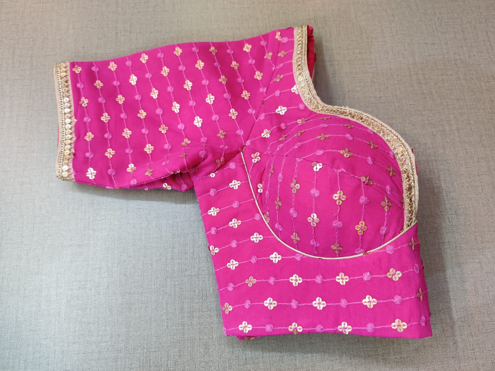 Beautiful magenta pink georgette designer saree blouse. Buy readymade saree blouses in USA from Pure Elegance..