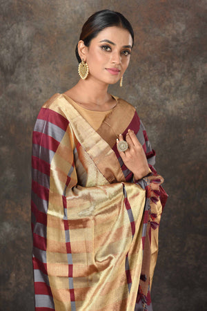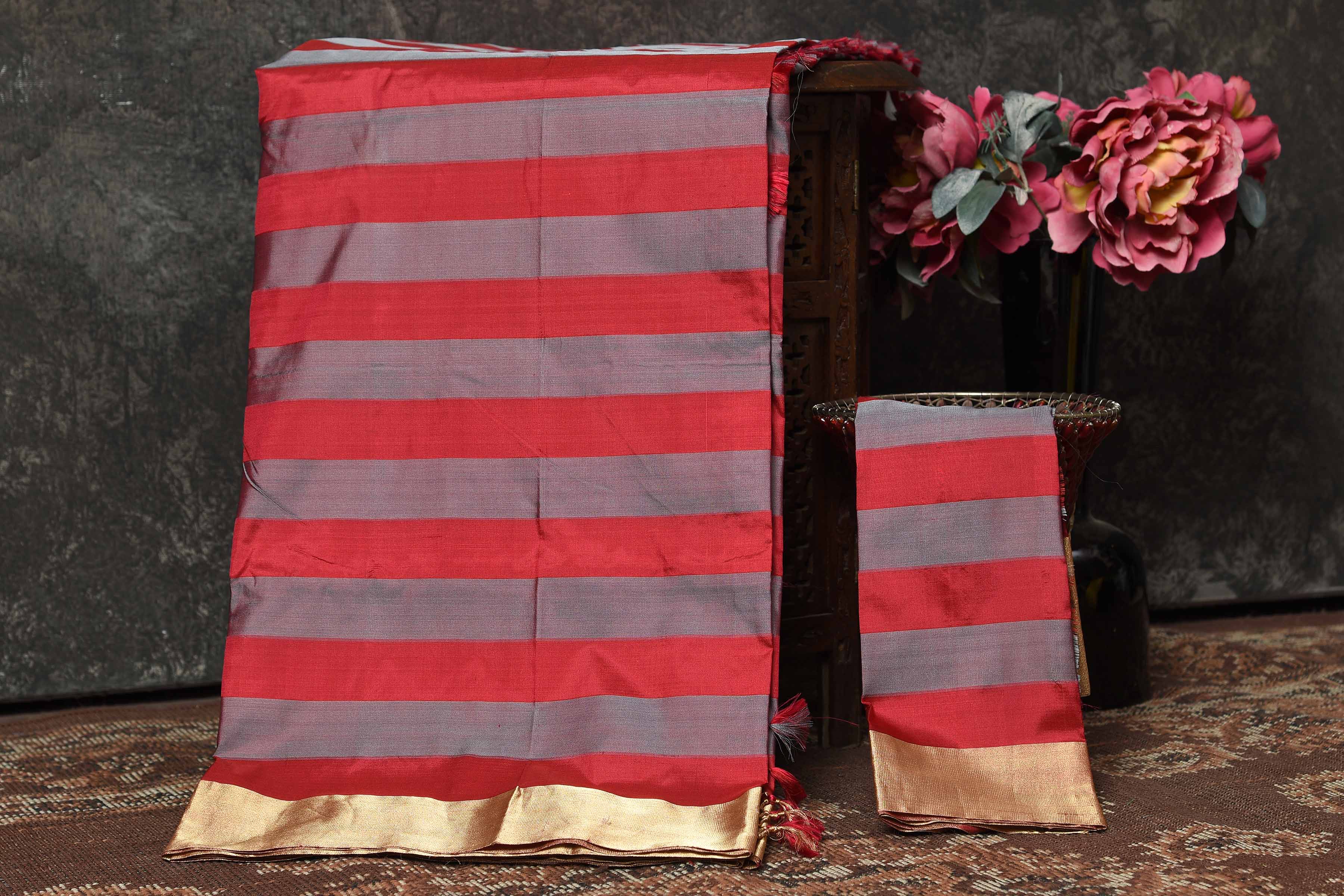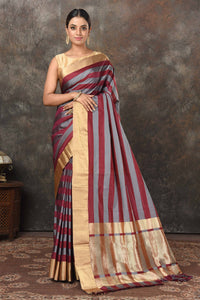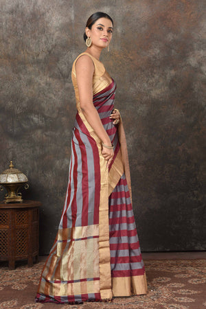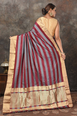 Radiate elegance on special occasions in this elegant maroon grey stripes Mashru silk Banarasi saree with golden border. It comes with a beautiful blouse piece.