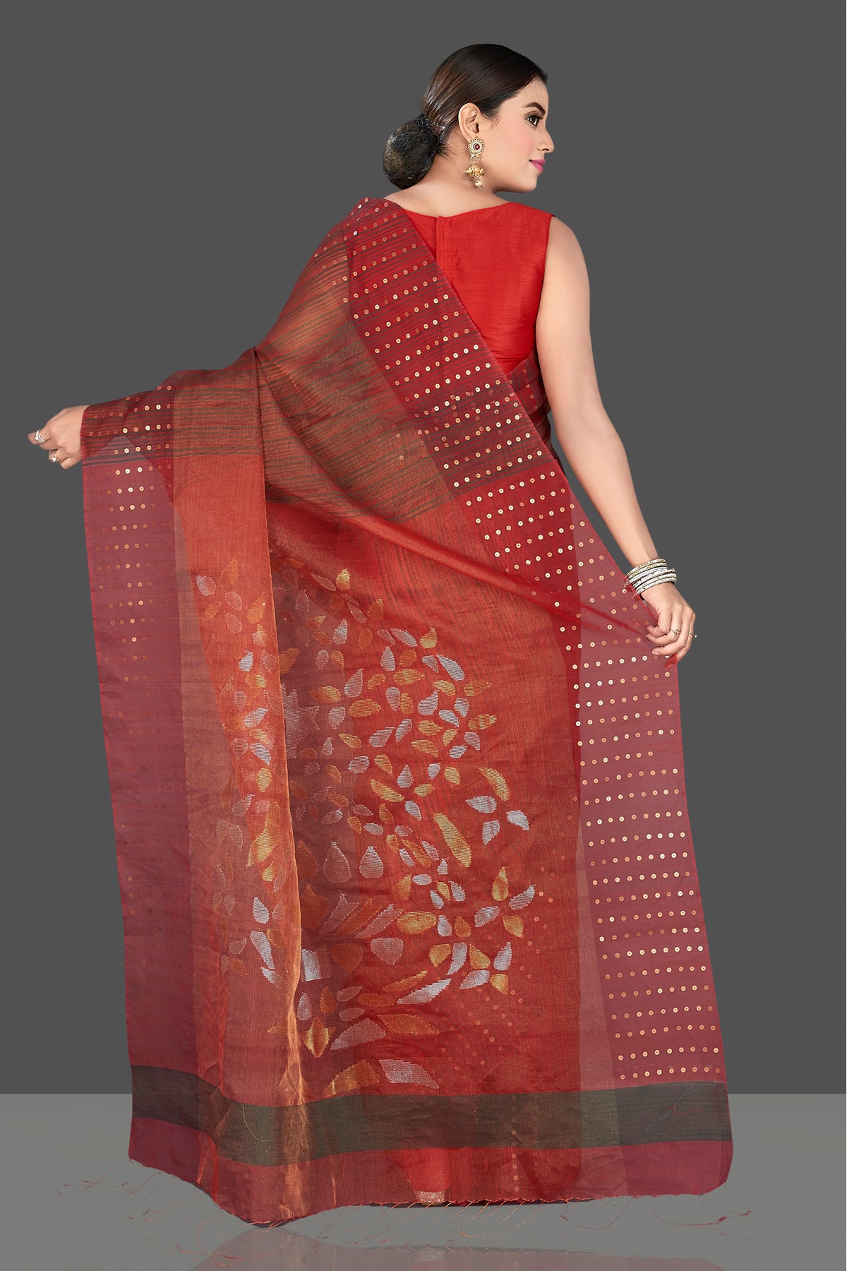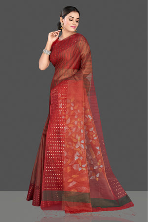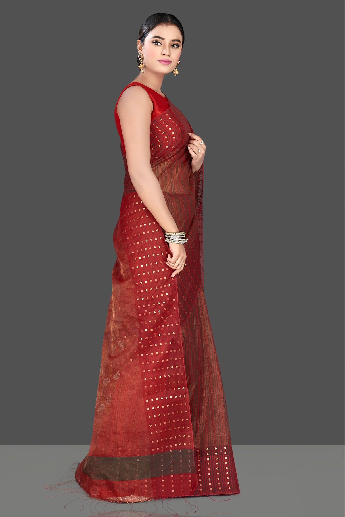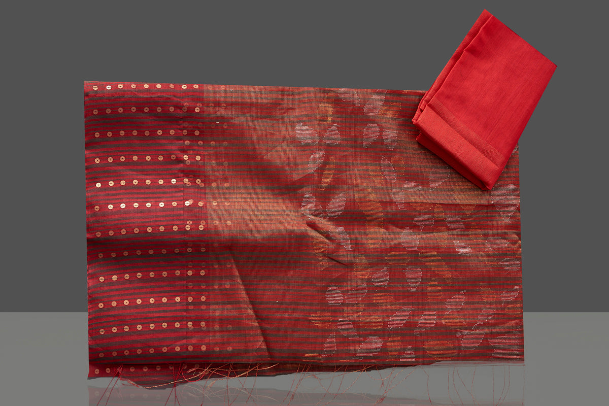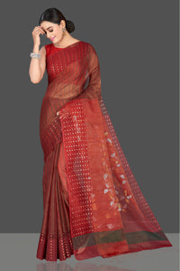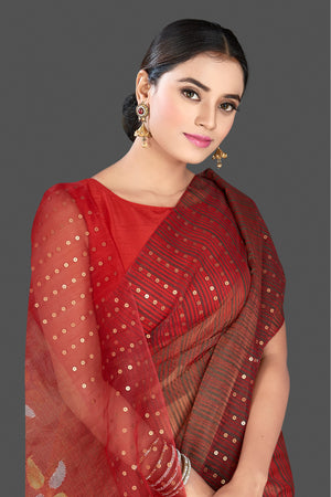 Be a vision of elegance on festive occasions and parties in this gorgeous maroon muslin Jamdani saree with sequin border. It comes with a matching blouse piece.