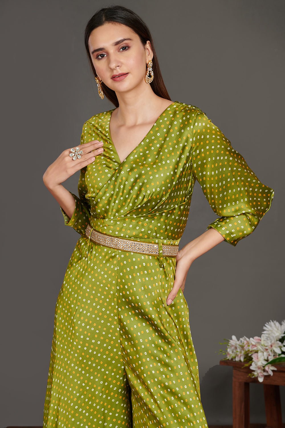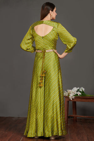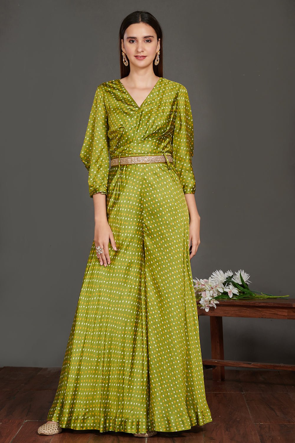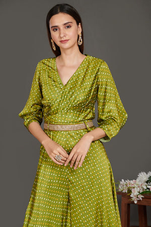 Go for this chic mehendi green Bandhej print jumpsuit with belt. Shop beautiful suits in USA from Pure Elegance.