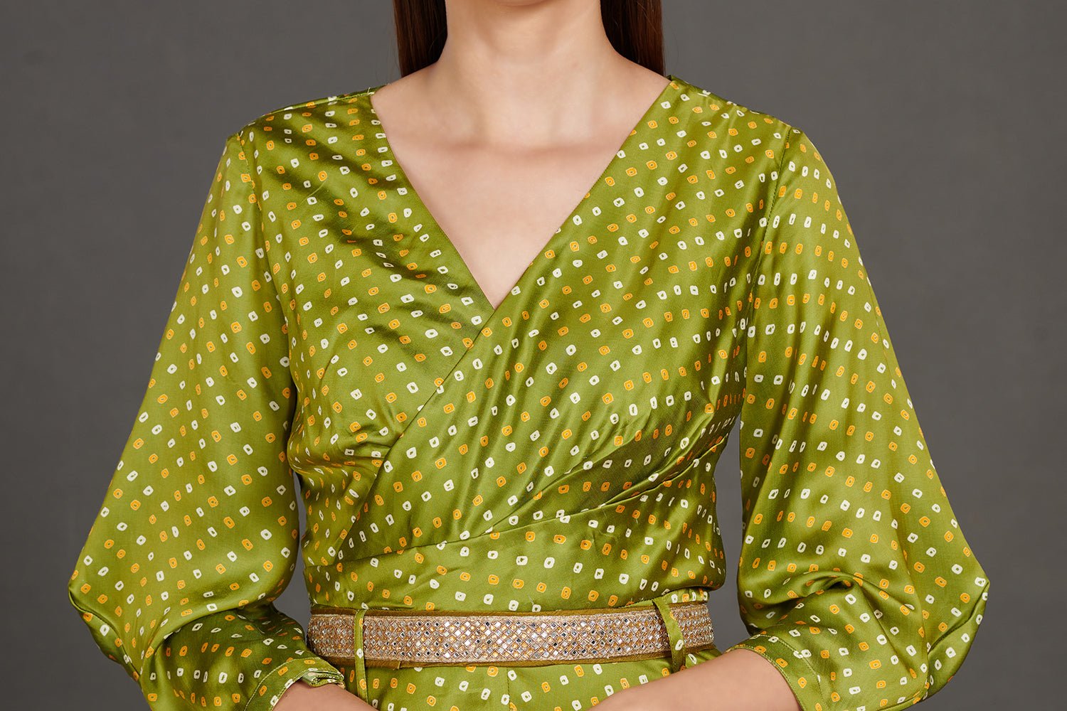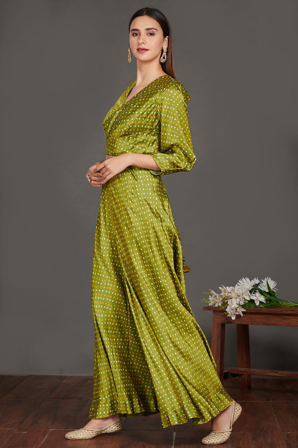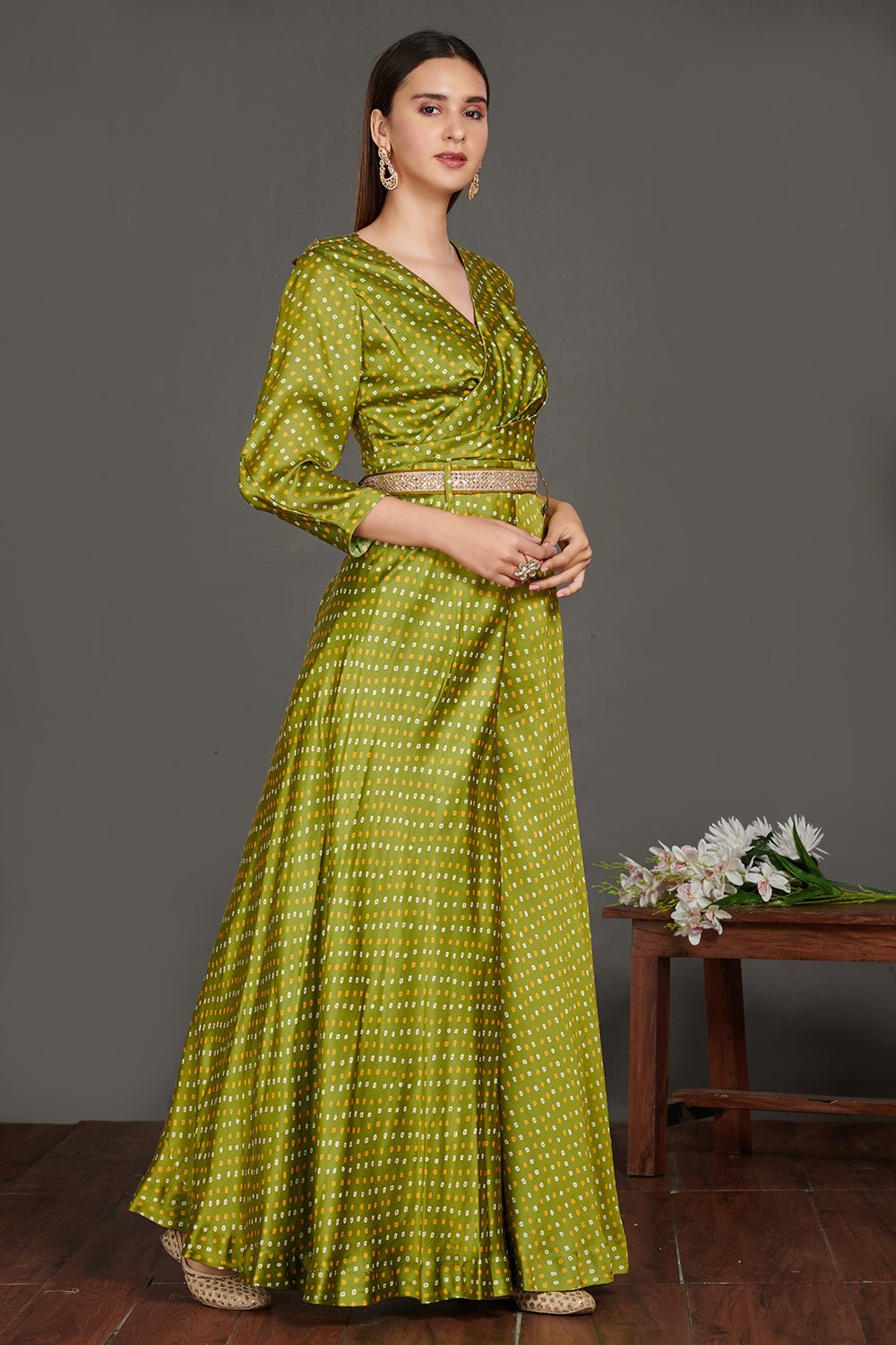 Go for this chic mehendi green Bandhej print jumpsuit with belt. Shop beautiful suits in USA from Pure Elegance.