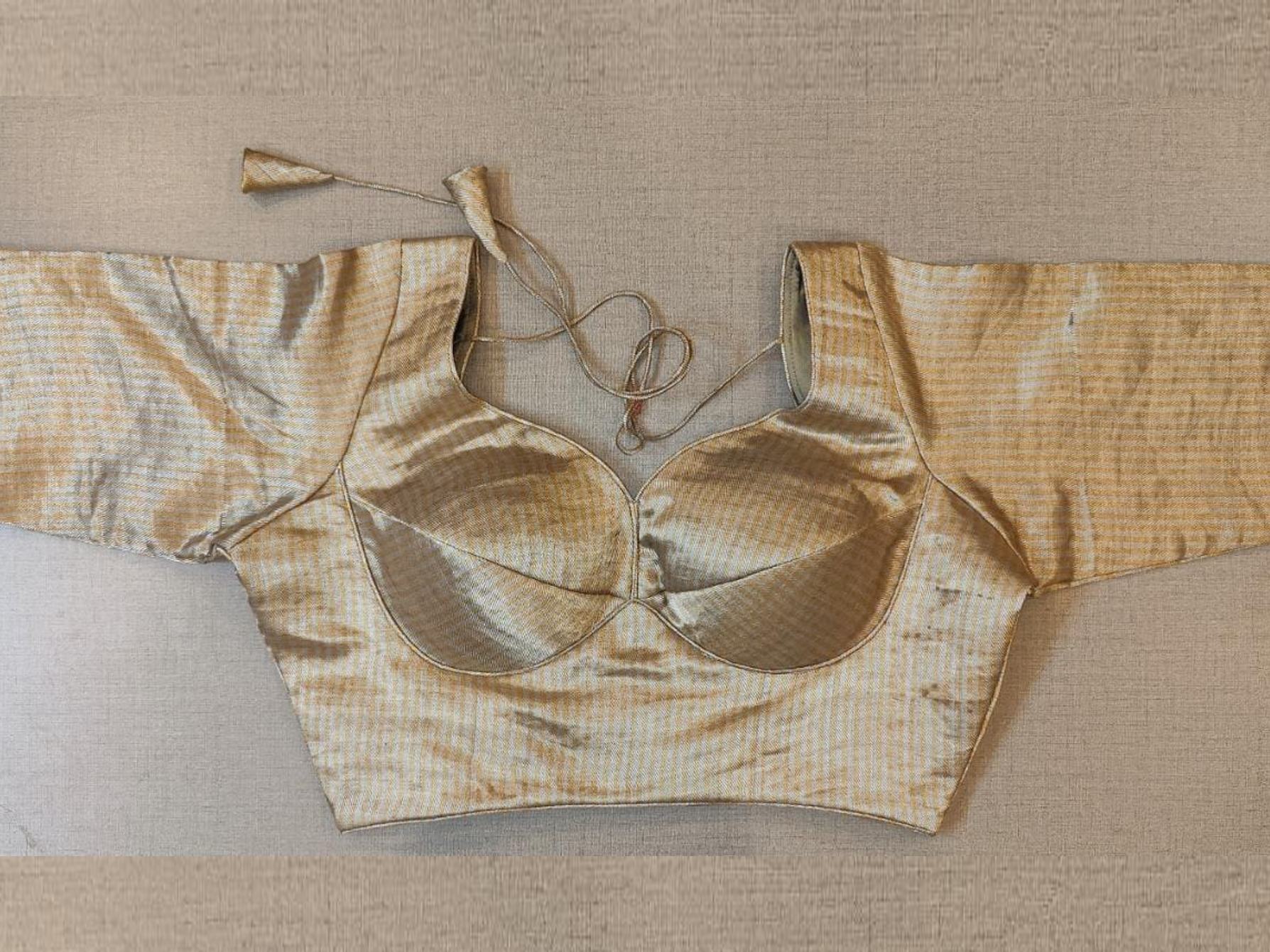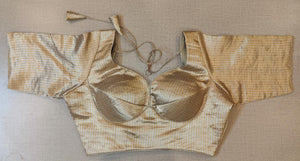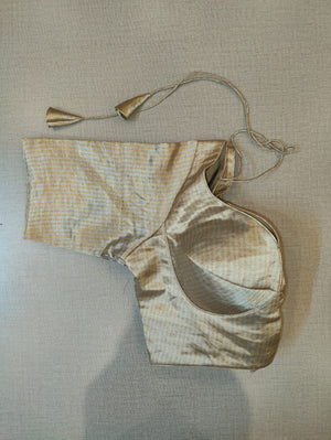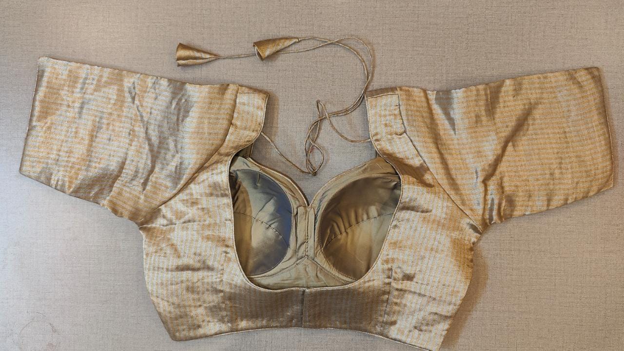 Stunning metallic beige golden stripes choli-cut saree blouse. Buy designer blouse in USA from Pure Elegance.