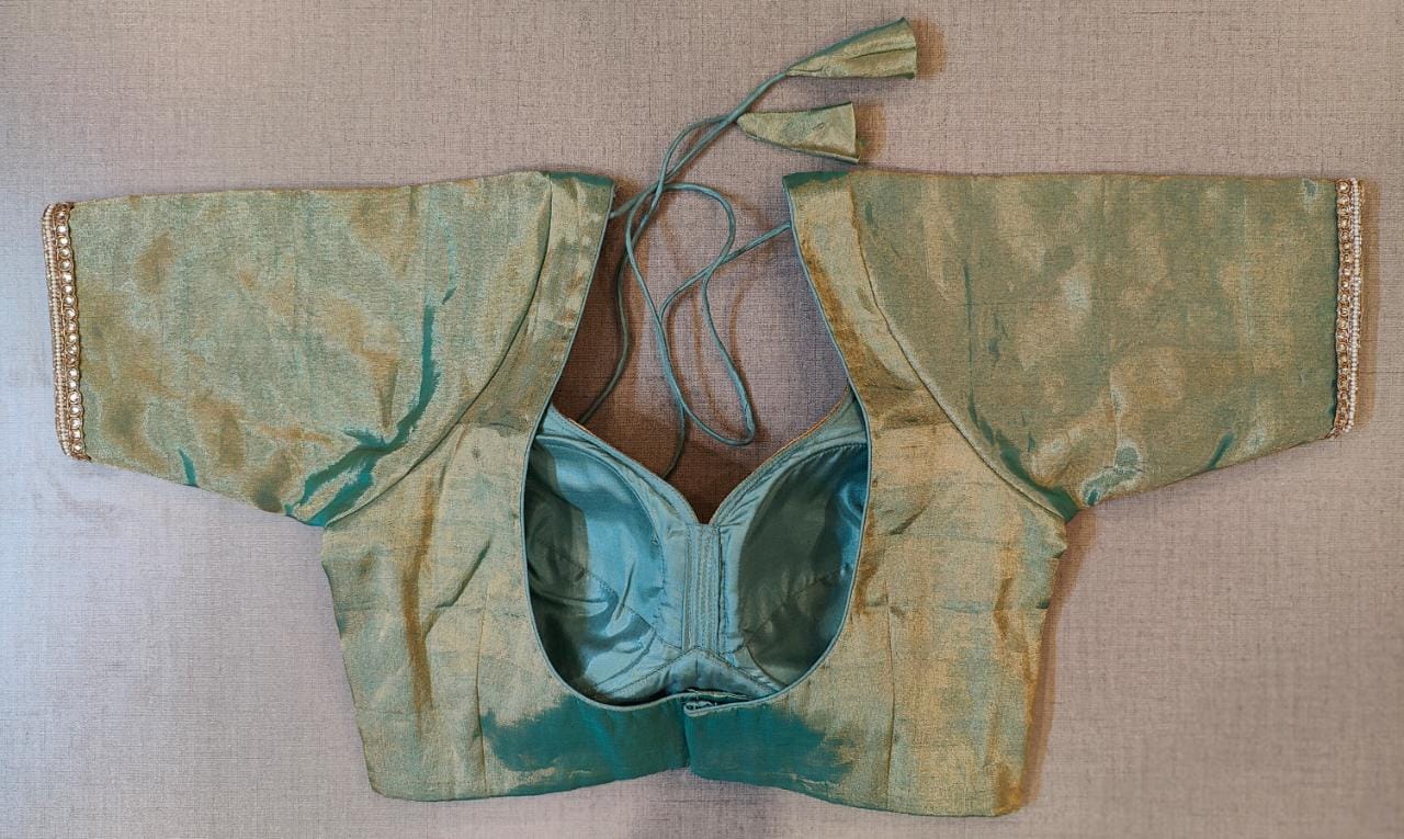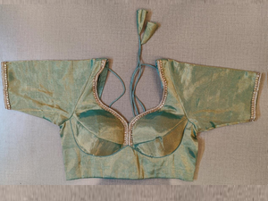 Stunning metallic green choli-cut saree blouse with stone work lace. Buy designer blouse in USA from Pure Elegance.