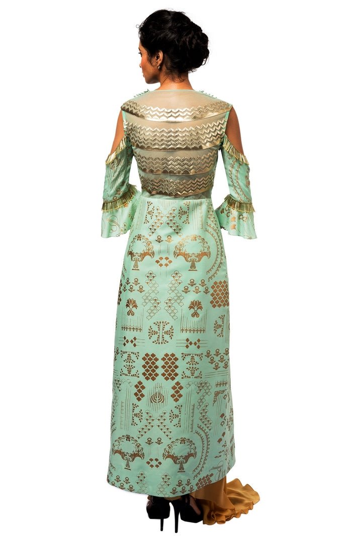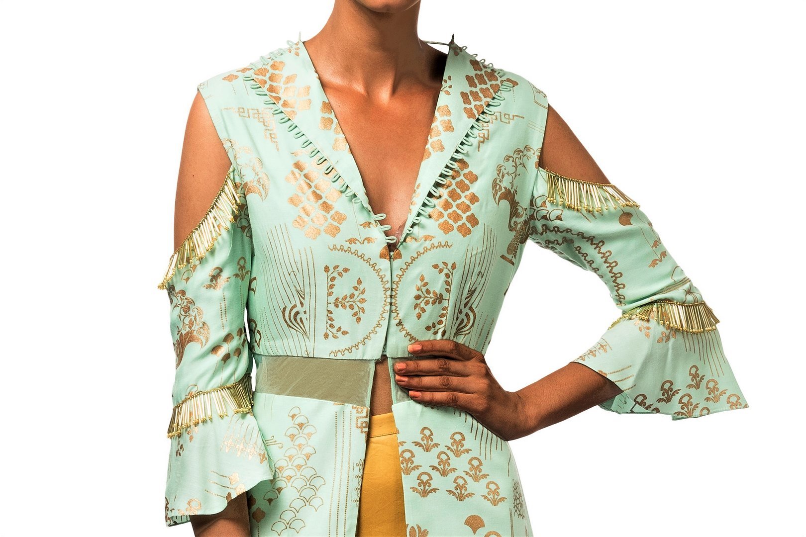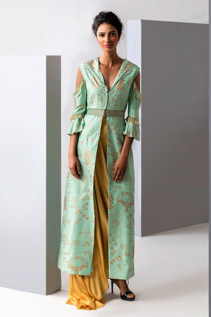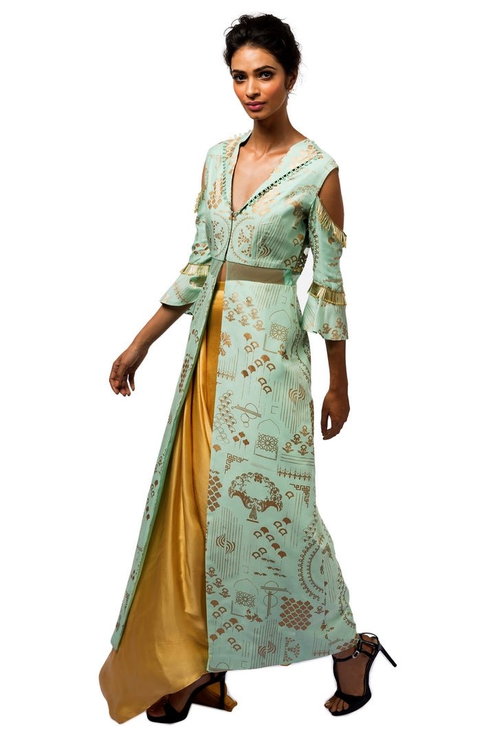 Absolutely stunning and unique ensemble for parties! This mint green embellished jacket with golden draped dhoti skirt is sure to attract lot of attention. It is crafted in dupion silk. Shop online at Pure Elegance or visit our store in USA!