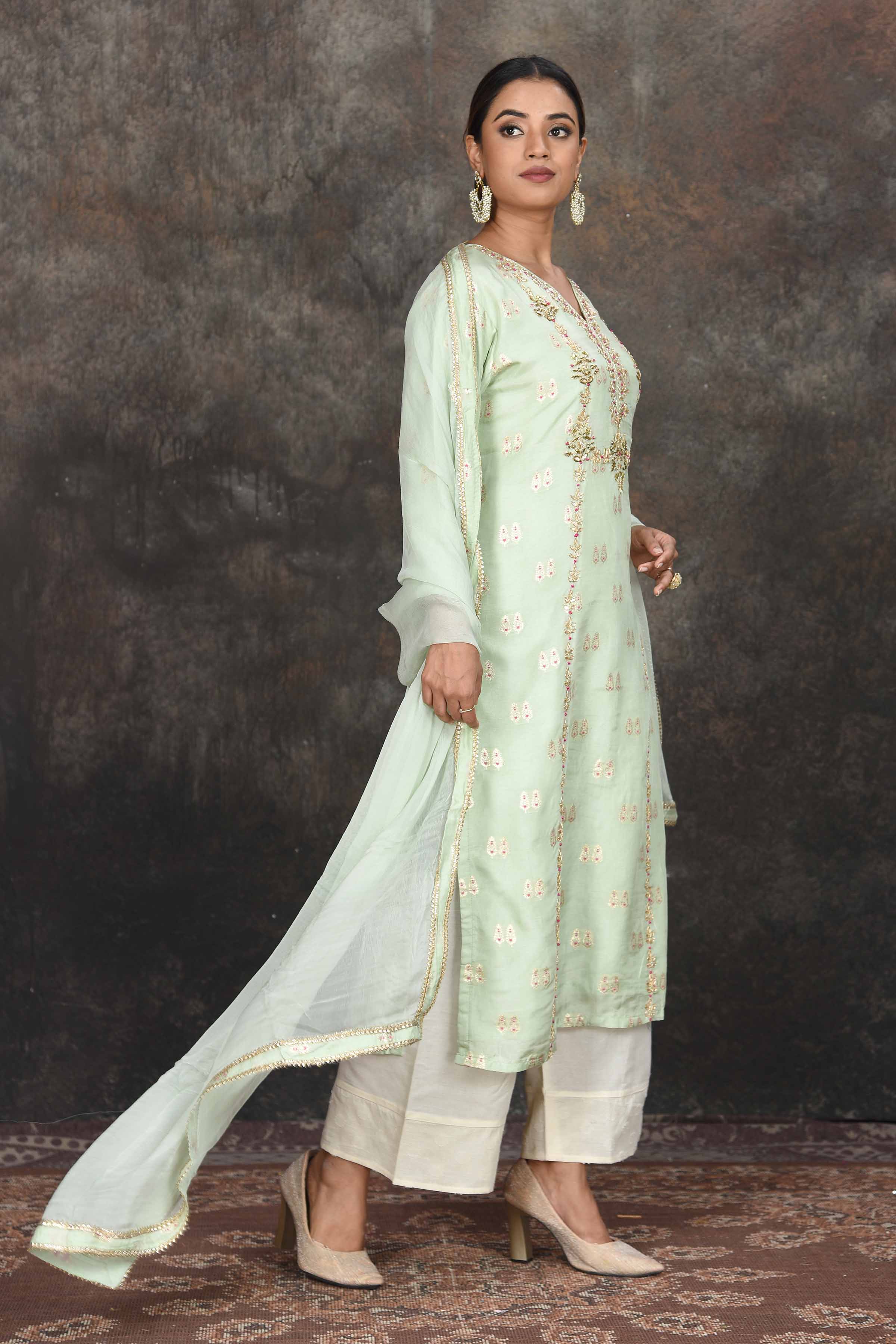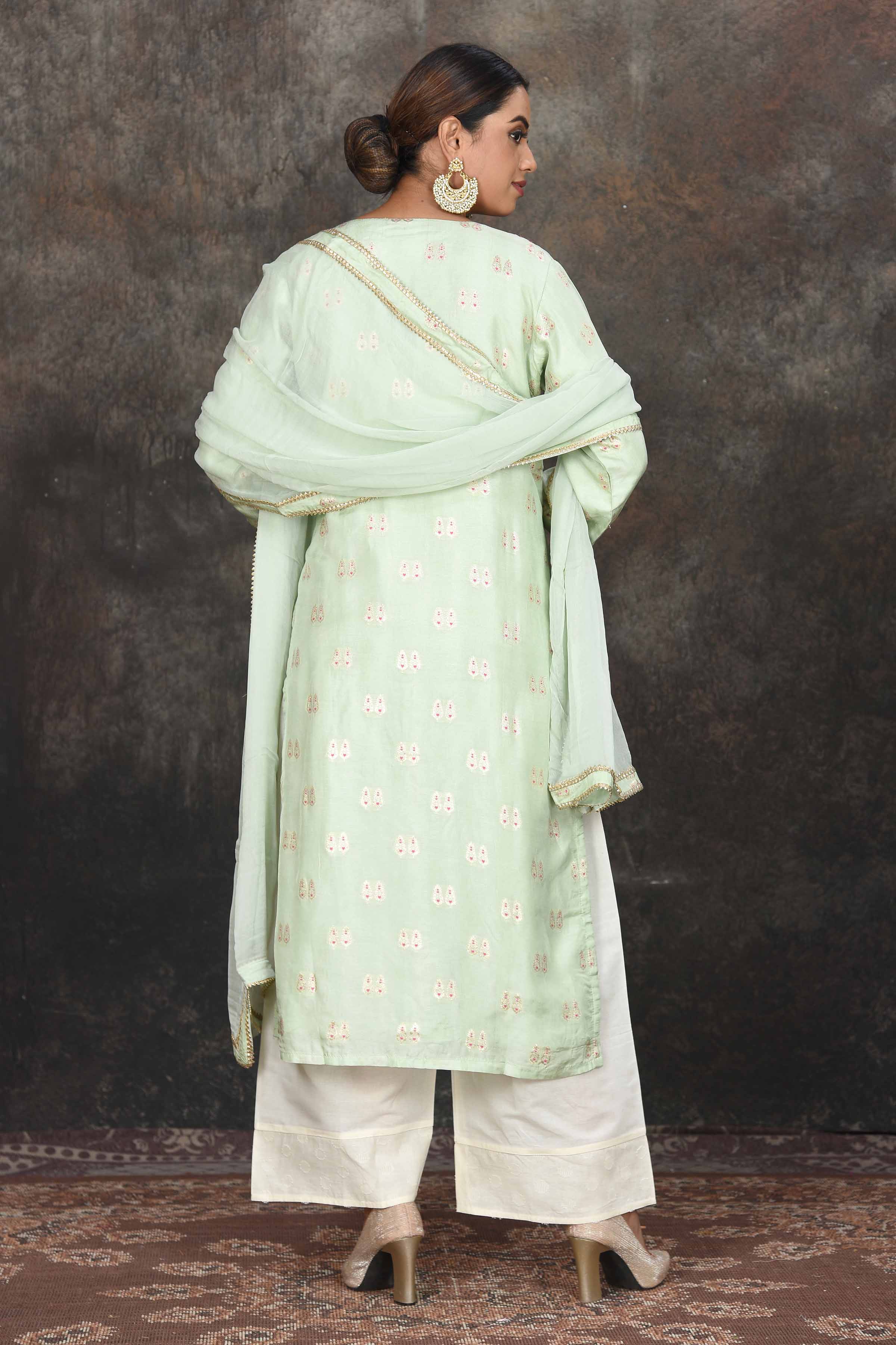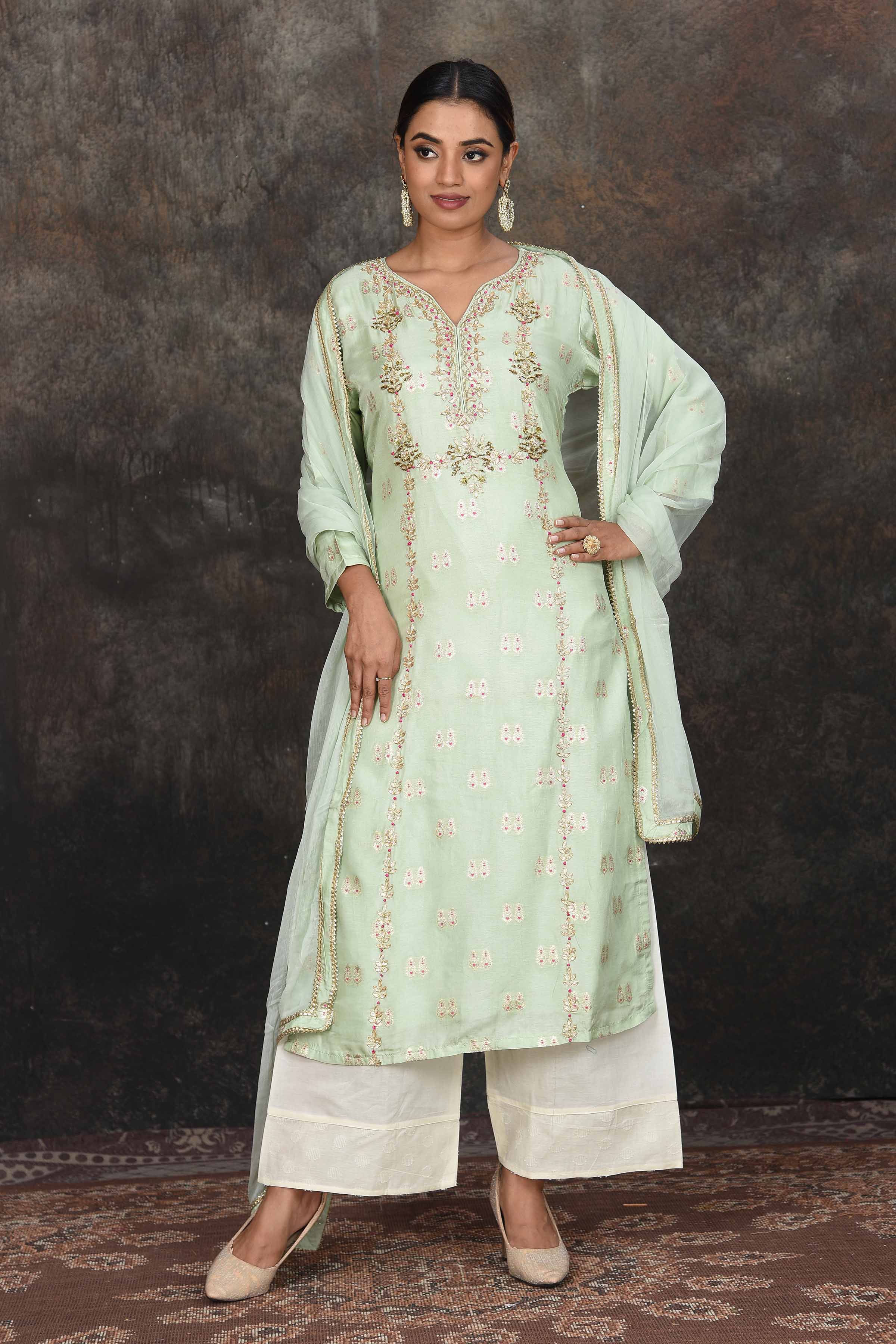 Dazzle on festive occasions in this elegant mint green embroidered palazzo suit. It comes with a matching dupatta. Shop designer dresses in USA from Pure Elegance.