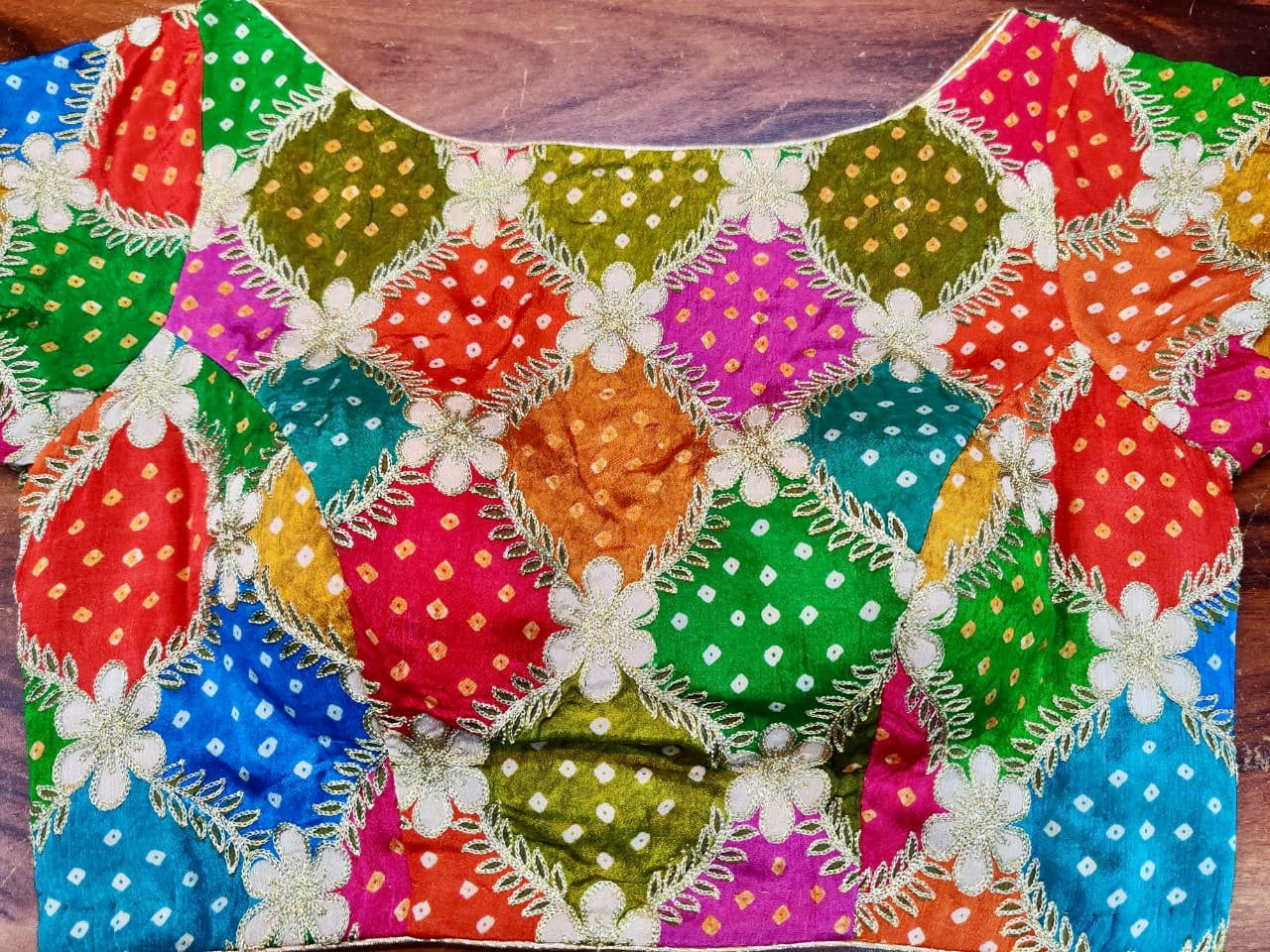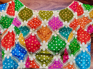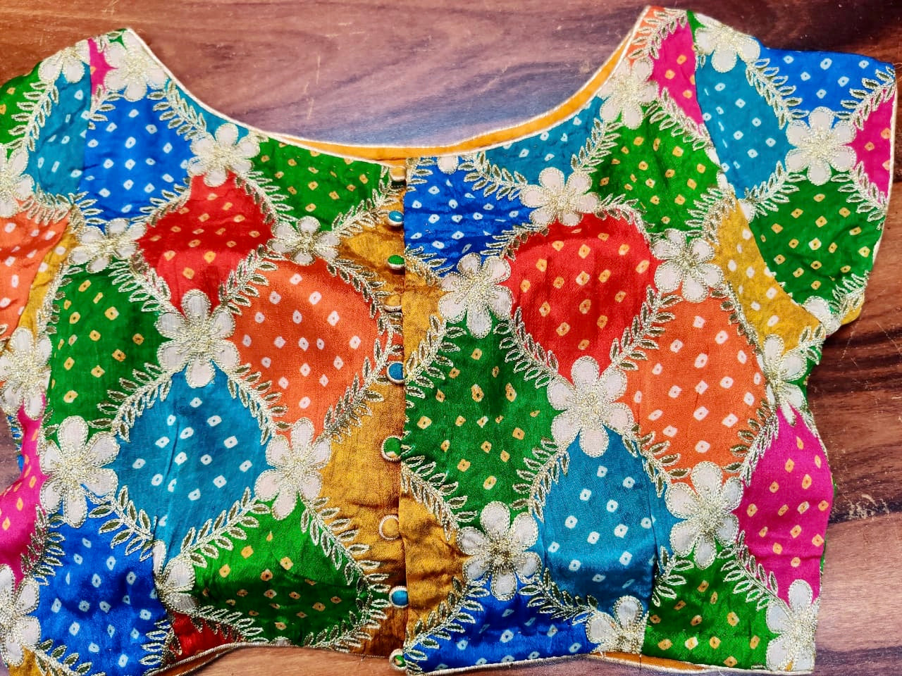Beautiful multicolor embroidered Bandhej saree blouse. Shop designer saree blouse online in USA from Pure Elegance.