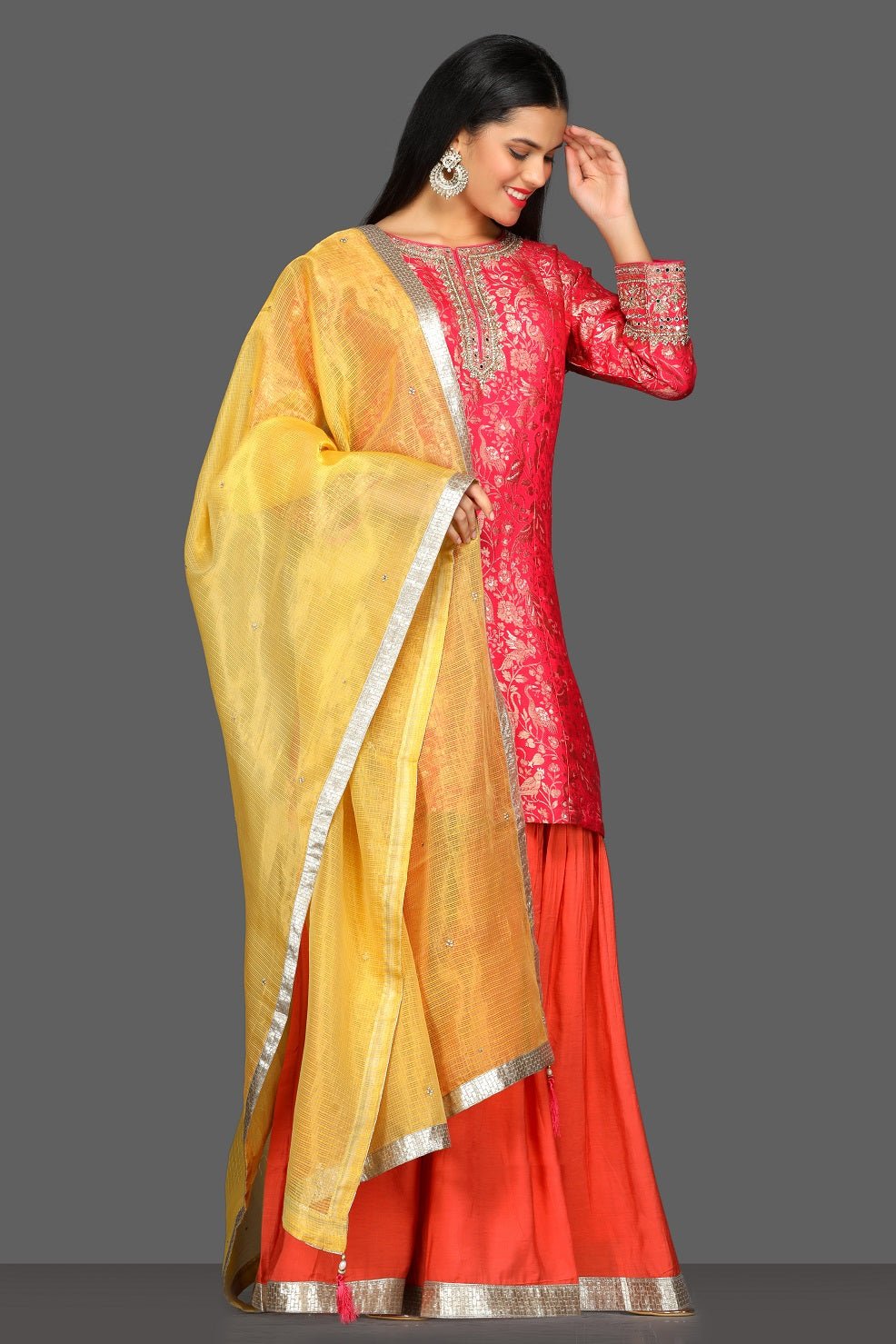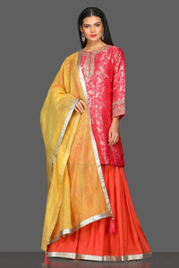 Paint a colorful picture on festive occasions with this multicolor embroidered skirt set. The set comes with a yellow dupatta. Buy online from Pure Elegance.