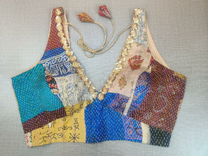 Gorgeous multicolor patch Kantha sleeveless sari blouse with embroidered neckline. Buy designer blouse in USA from Pure Elegance.