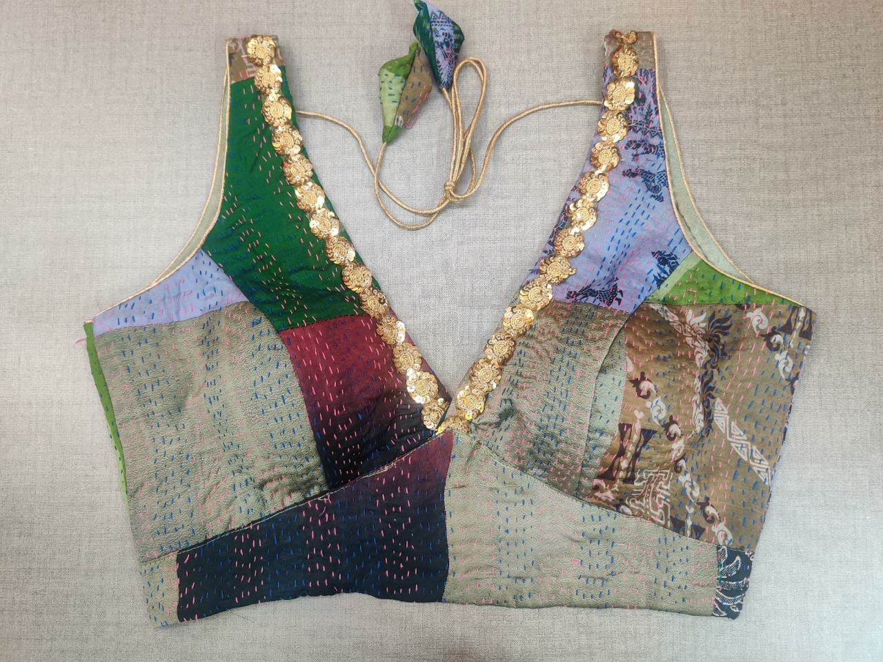 Gorgeous multicolor patch work Kantha stitch sleeveless saree blouse with embroidered neckline. Buy designer blouse in USA from Pure Elegance.