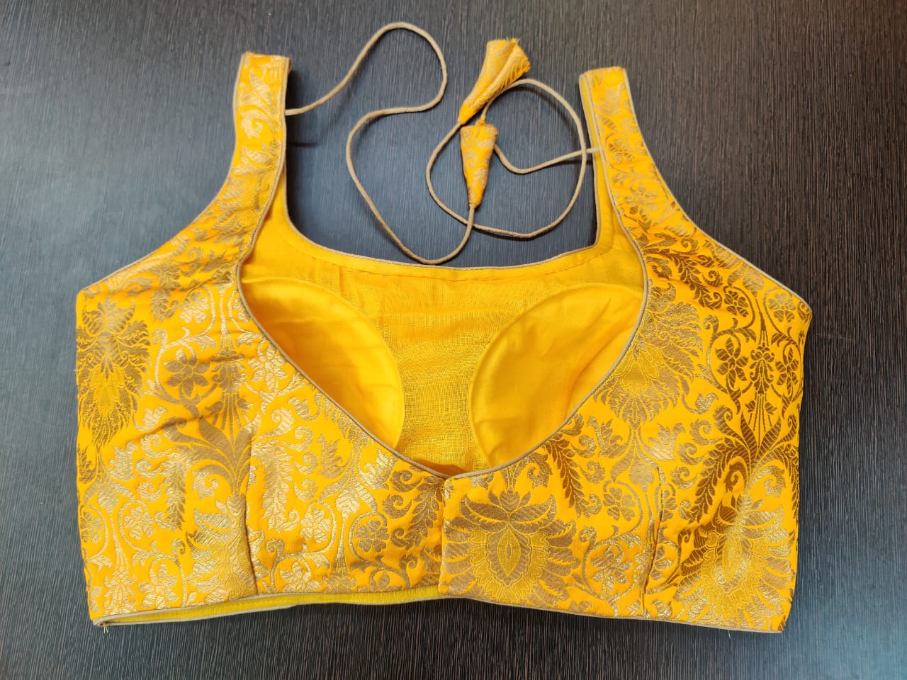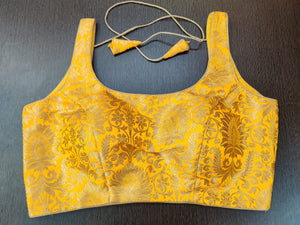 Beautiful yellow sleeveless Banarasi sari blouse. Buy designer blouse in USA from Pure Elegance.