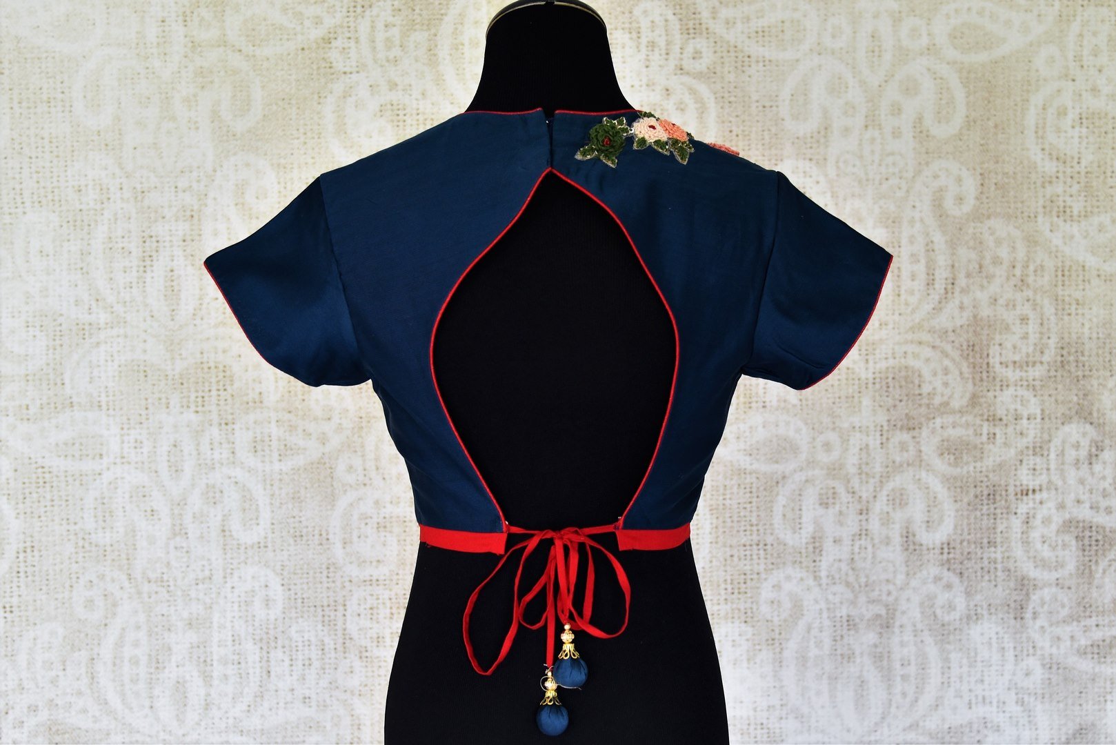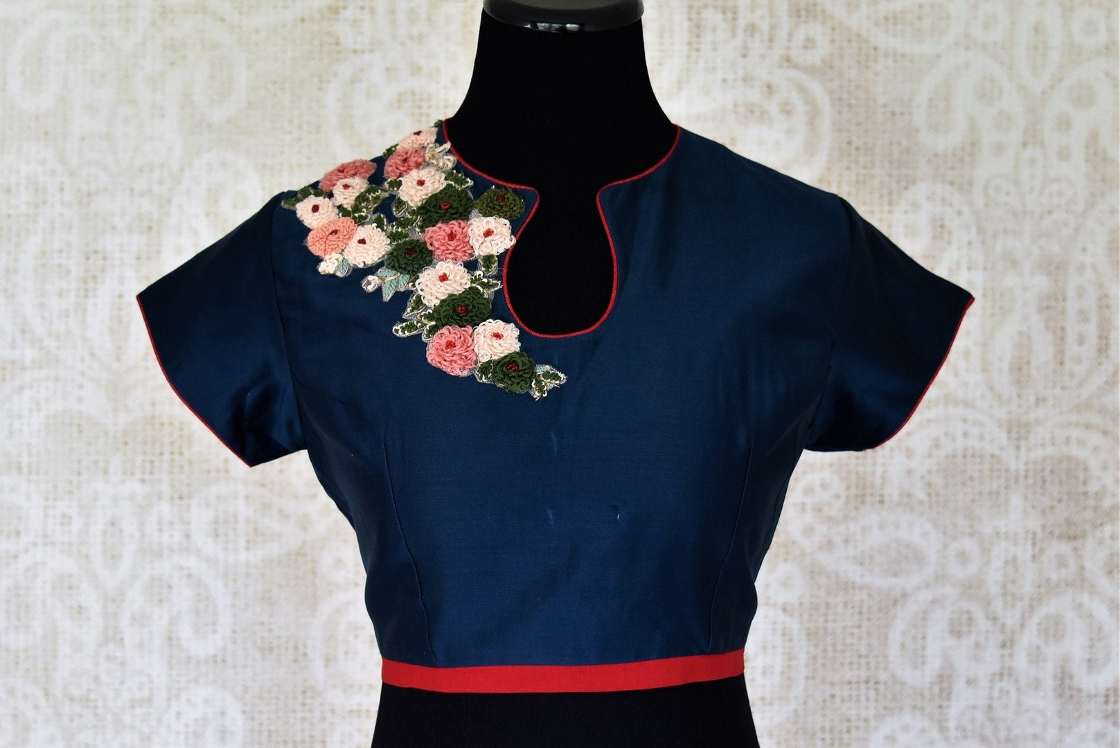 Gorgeous navy blue embroidered chanderi saree blouse for elevating your ethnic sari look. The blouse is adorned with floral embroidery and has a stunning leaf shape back design. Shop online at Pure Elegance or visit our store in USA.