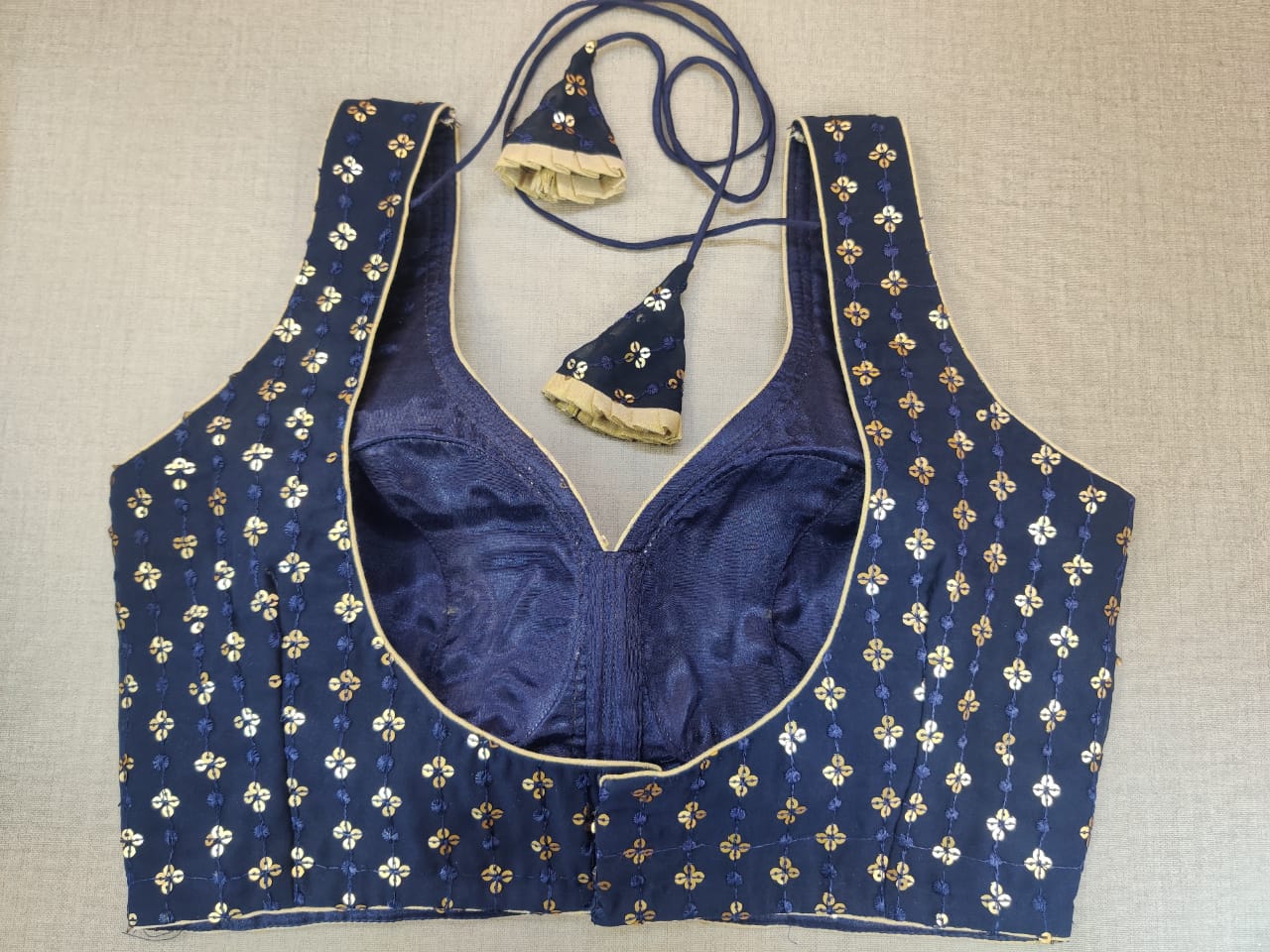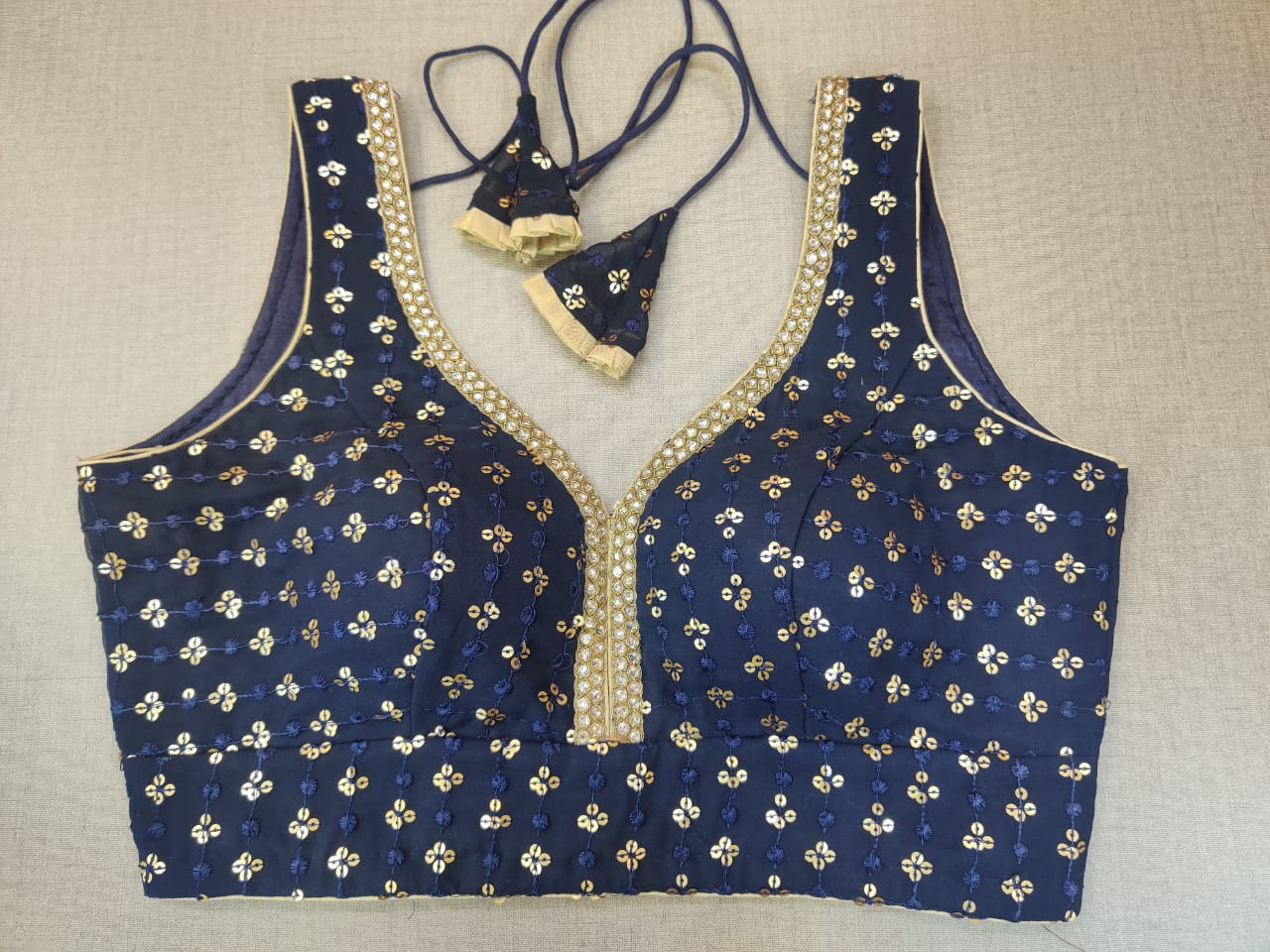 Beautiful navy sleeveless saree blouse with golden embroidery. Buy designer blouse in USA from Pure Elegance.