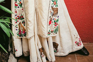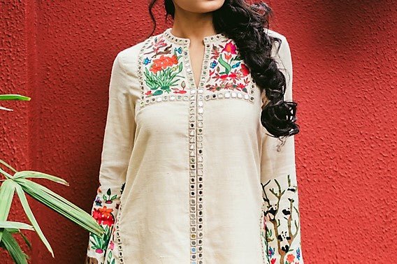 Set style standards high with this alluring off-white embroidered dress with skirt by Purvi Doshi. The dress is hand embroidered with aari and mirror work which makes it perfect for a summer party. Shop online at Pure Elegance or visit our store in USA!