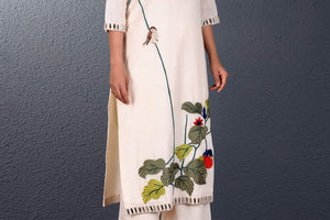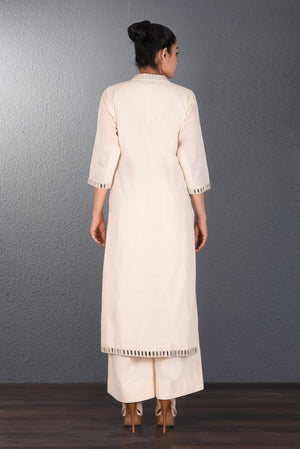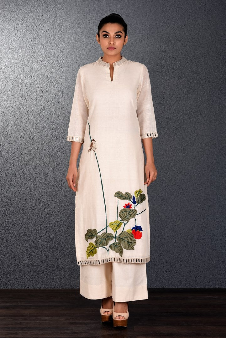 Elegant off-white parsi embroidery kurta with straight pants by Purvi Doshi. It is adorned with mirror work. Shop online at Pure Elegance or visit our store in USA!