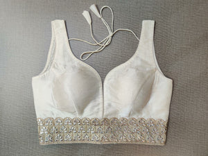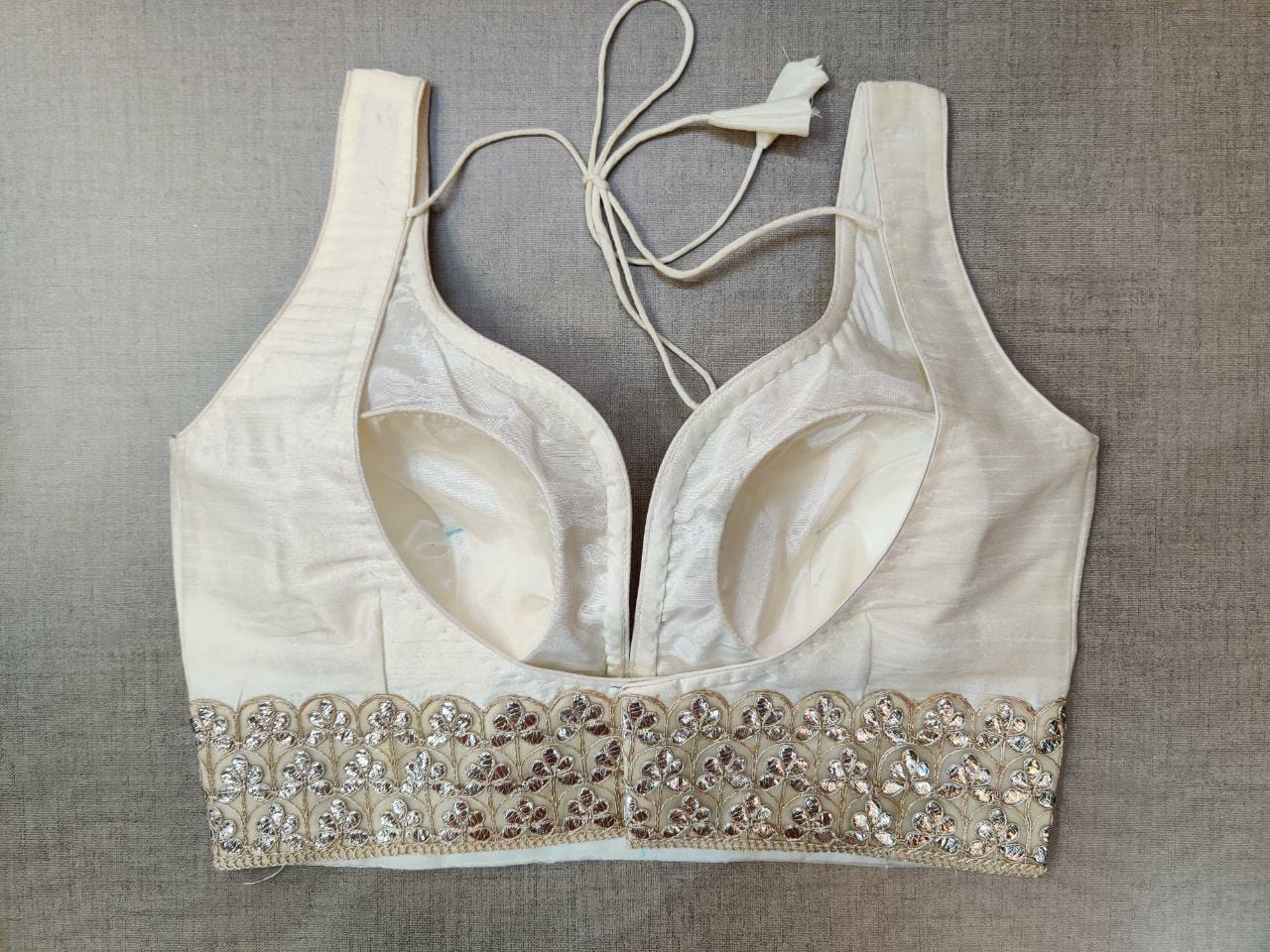 Beautiful off-white sleeveless saree blouse with lace border. Buy designer blouse in USA from Pure Elegance.