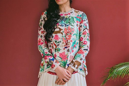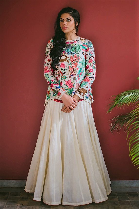 Make a unique fashion statement in this off-white slip dress with embroidered short top by Purvi Doshi. The top is hand embroidered with aari and mirror work which makes it perfect for special occasions. Shop online at Pure Elegance or visit our store in USA!