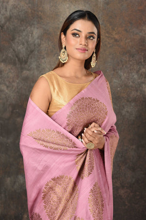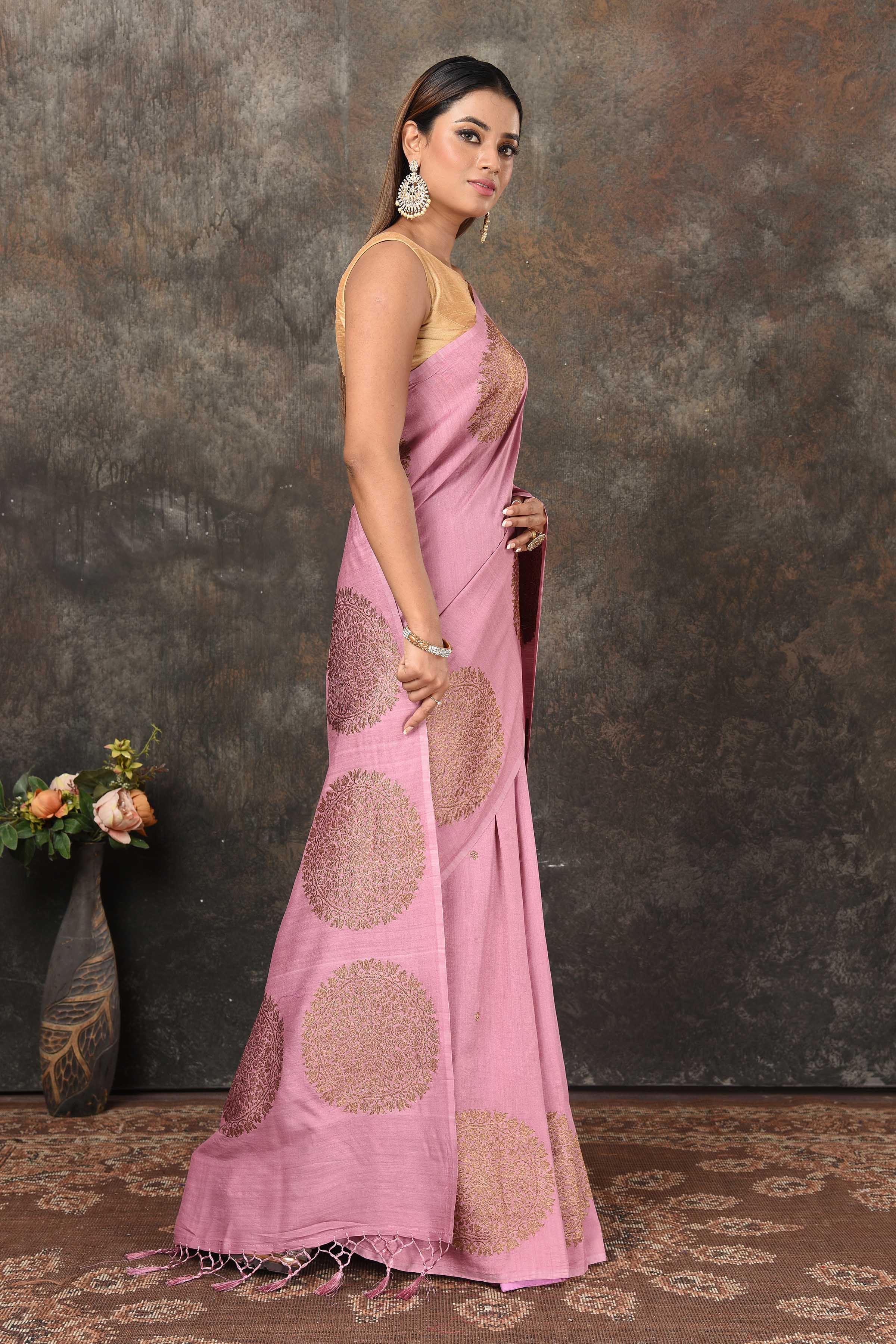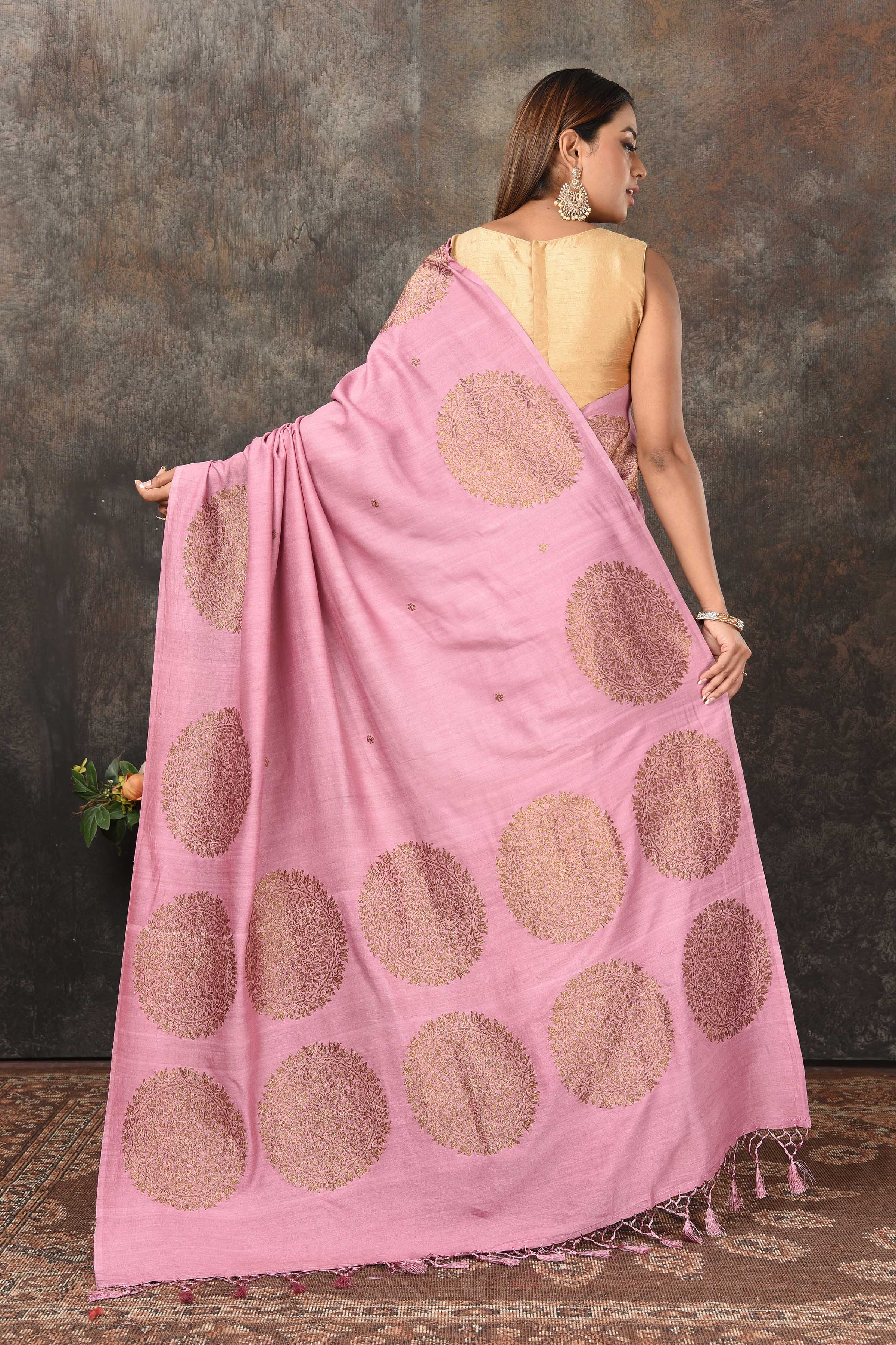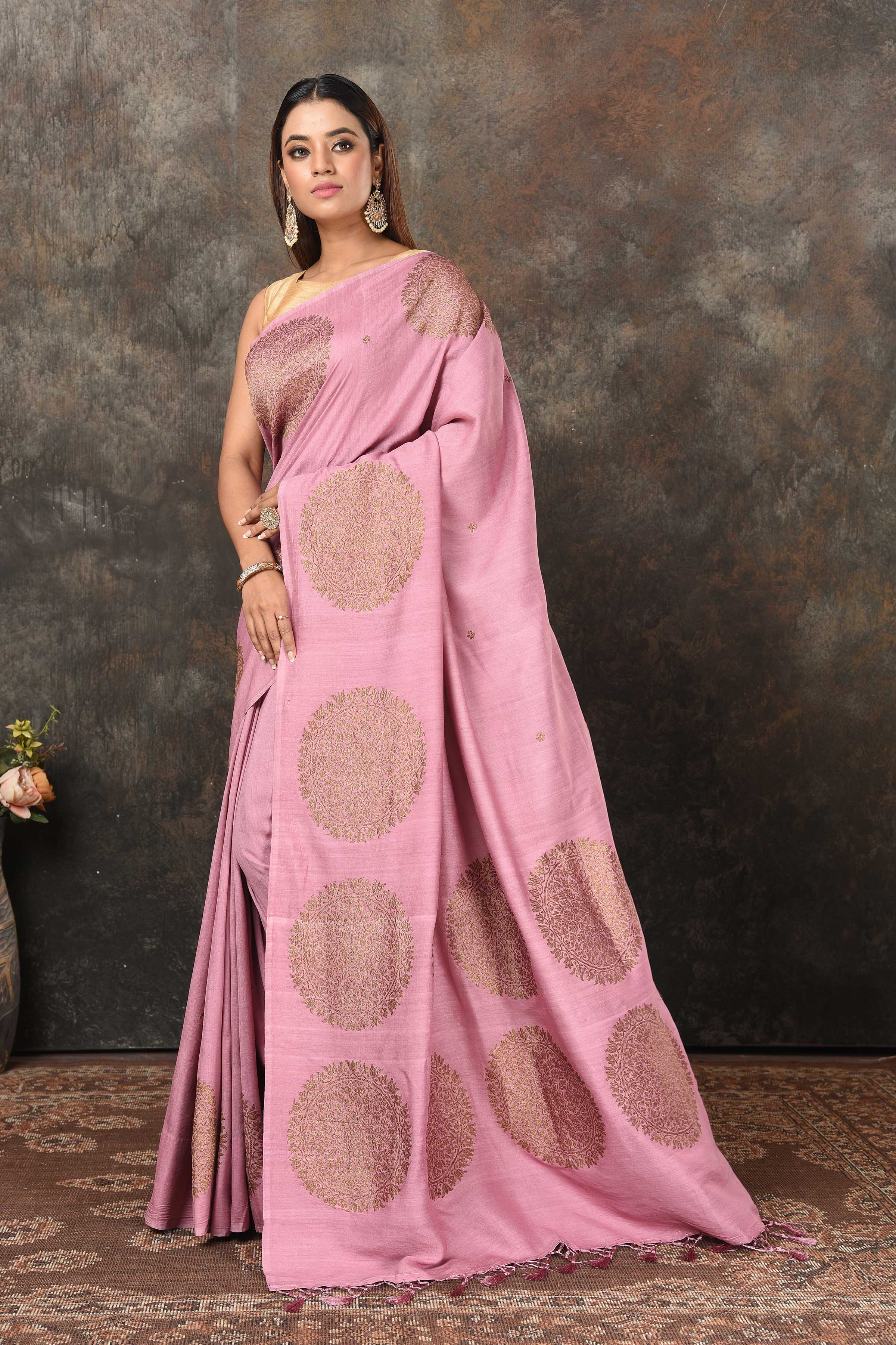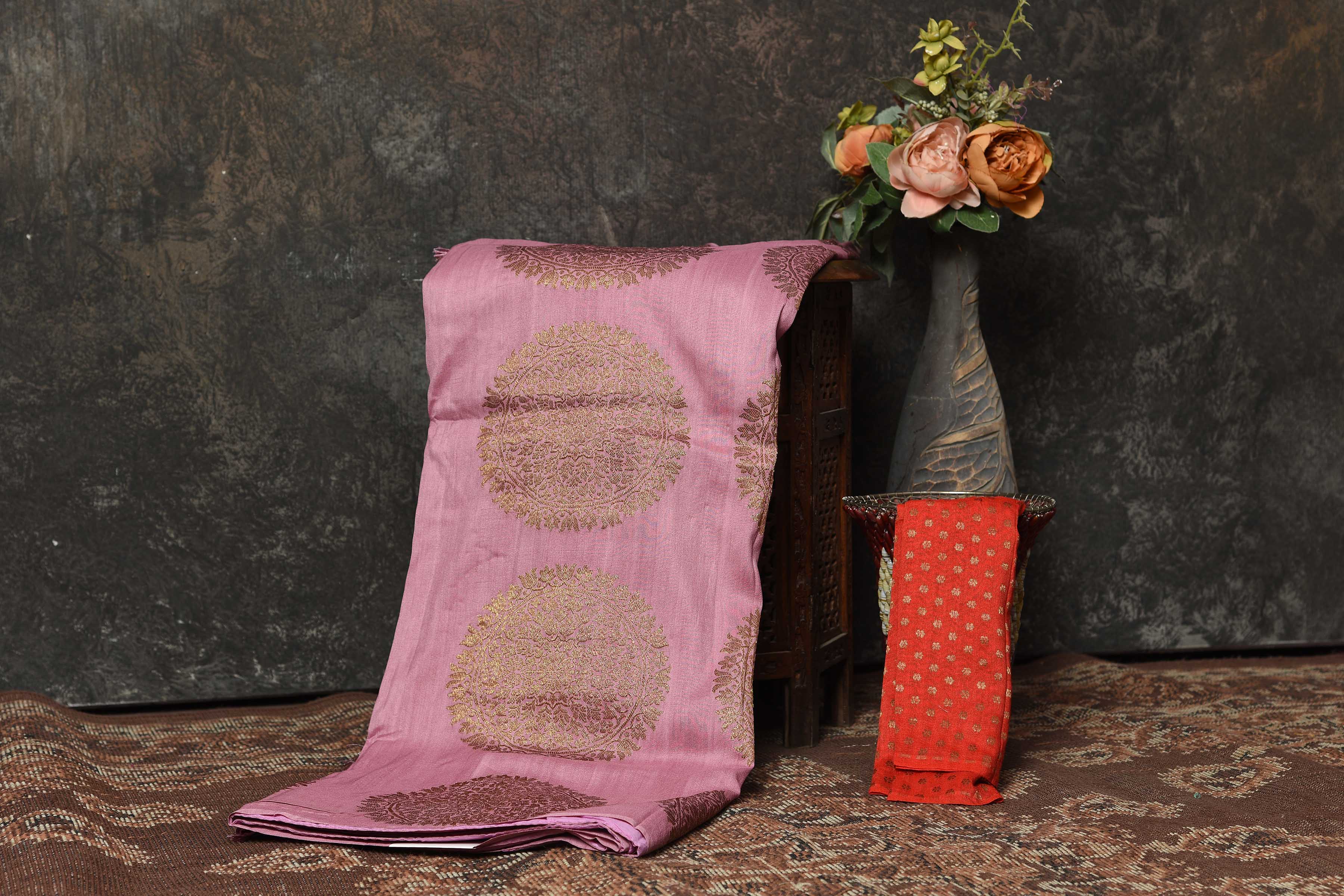 Look royal at weddings and festive occasions in this beautiful onion pink Banarsi saree. The saree has a beautiful antique zari motifs overall. It comes with a red blouse piece.