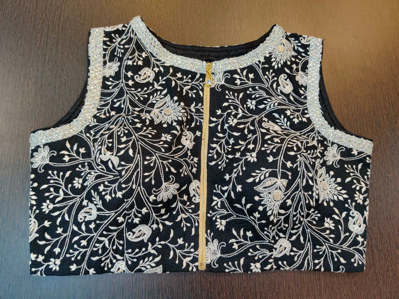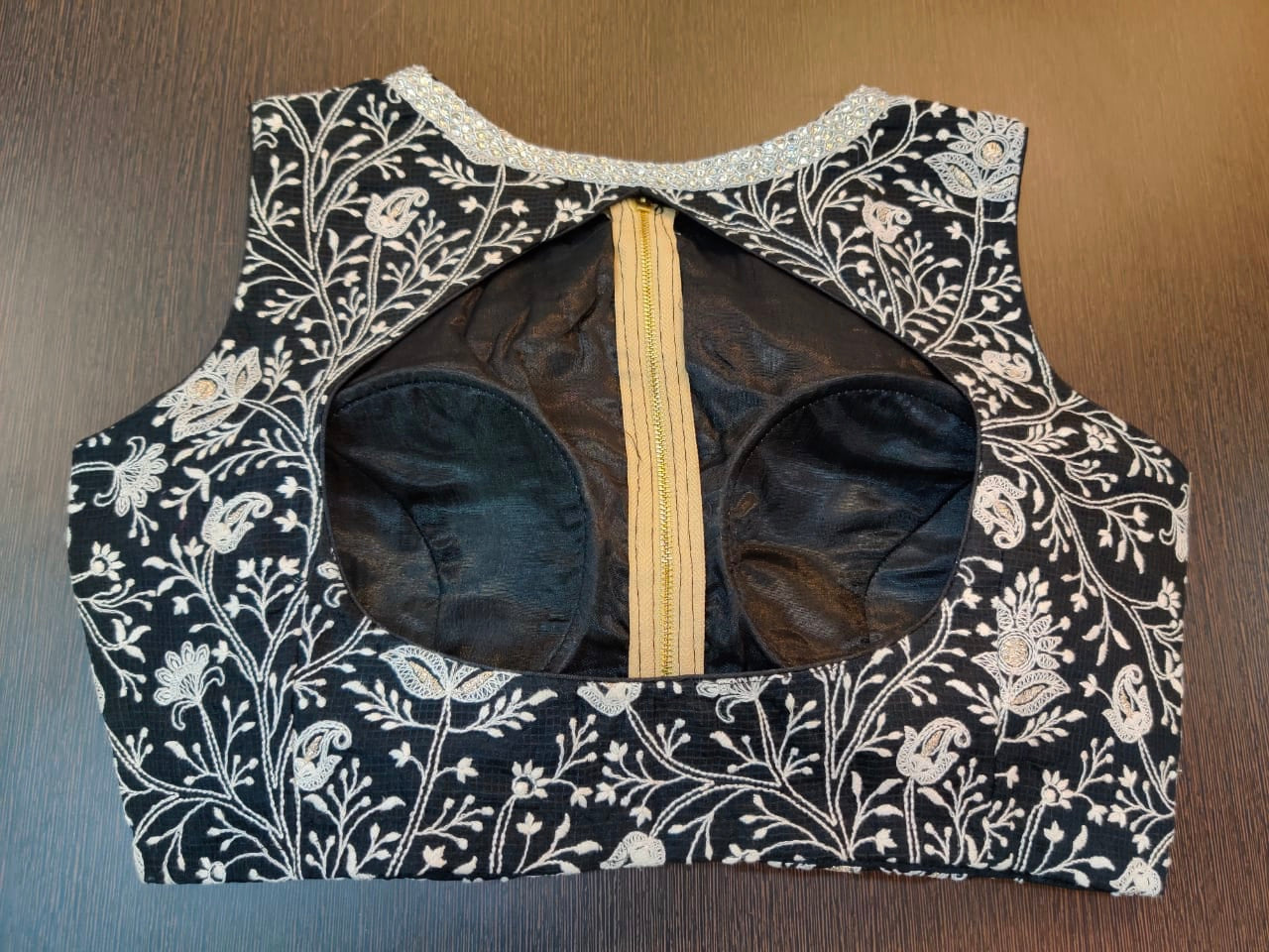 Gorgeous black sleeveless saree blouse with white floral embroidery. Shop designer saree blouse online in USA from Pure Elegance.
