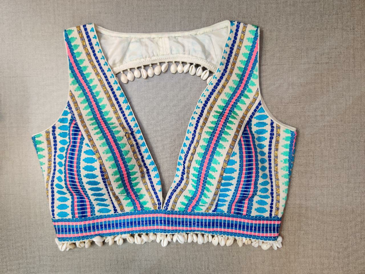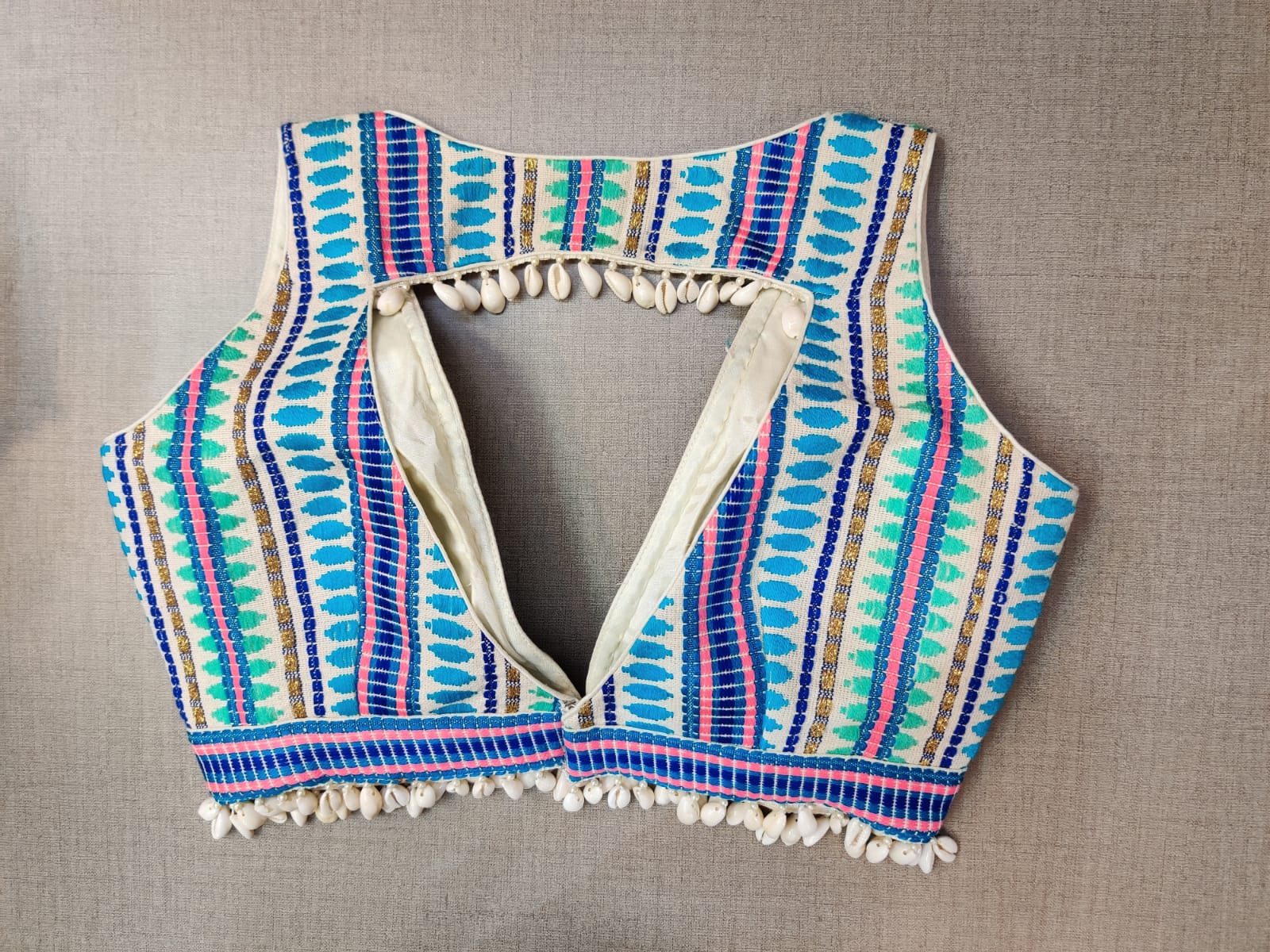 Contemporary blue and green threadwork sari blouse with shell tassels. Buy designer blouse in USA from Pure Elegance.