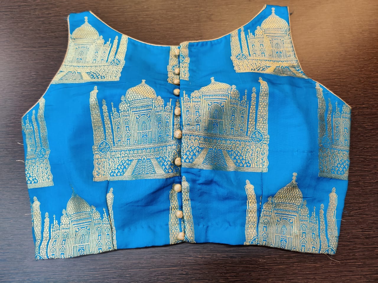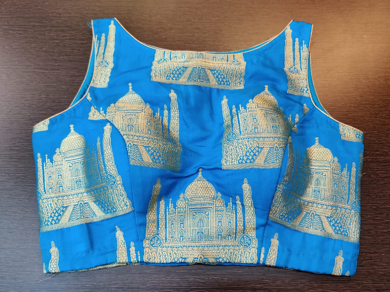 Gorgeous blue Banarasi sleeveless saree blouse with Taj Mahal zari buta. Shop designer saree blouse online in USA from Pure Elegance.