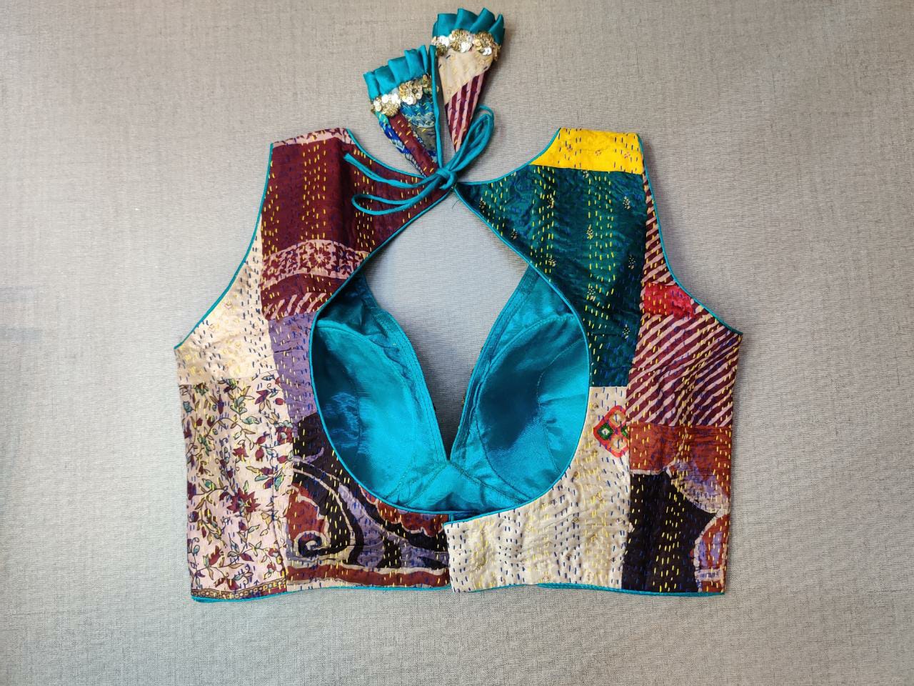 Pair your sarees with this beautiful blue multicolor patch sleeveless saree blouse for a perfect ethnic look. The blouse is enhanced with Kantha stitch and sequin embroidery. Buy designer blouse in USA from Pure Elegance..