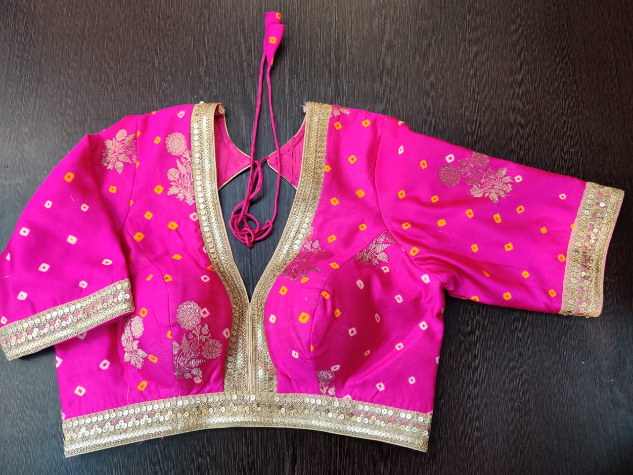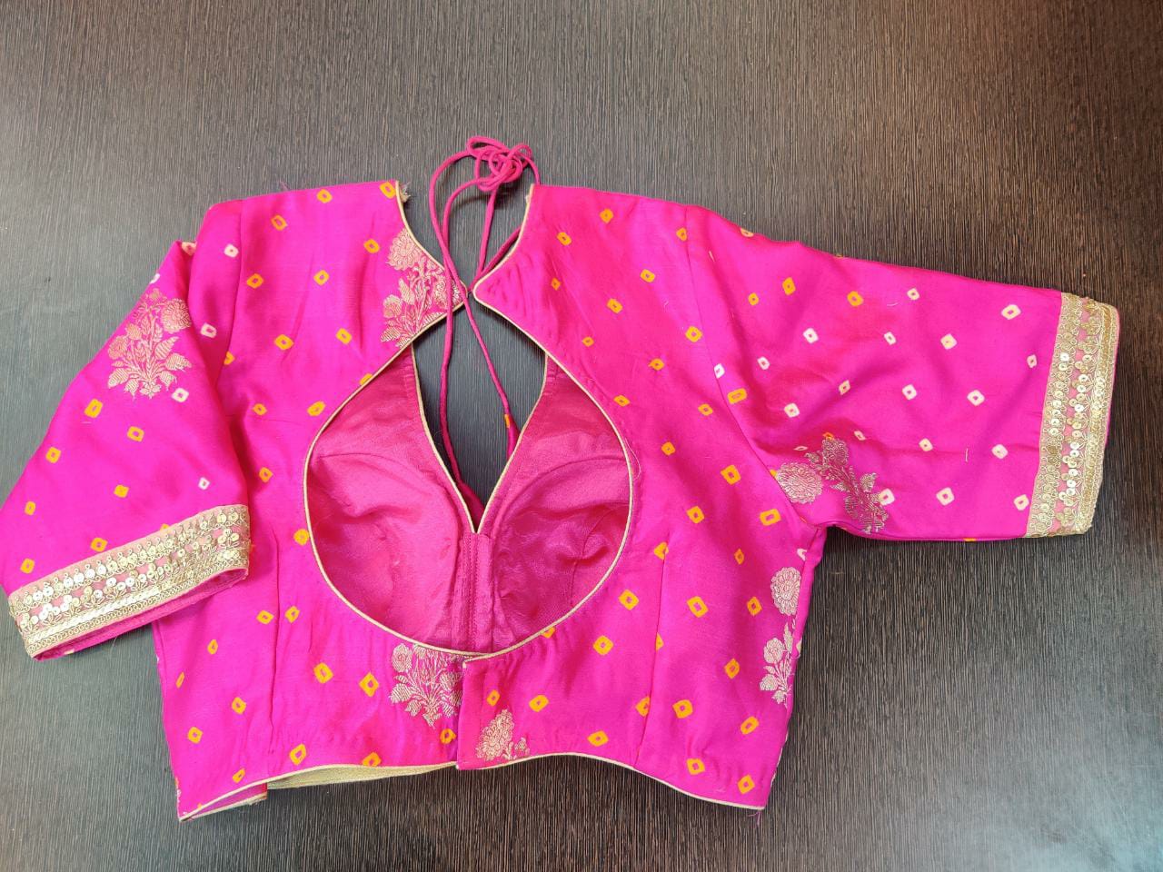 Gorgeous bright pink Bandhej embroidered saree blouse with zari buta. Buy designer blouse in USA from Pure Elegance.