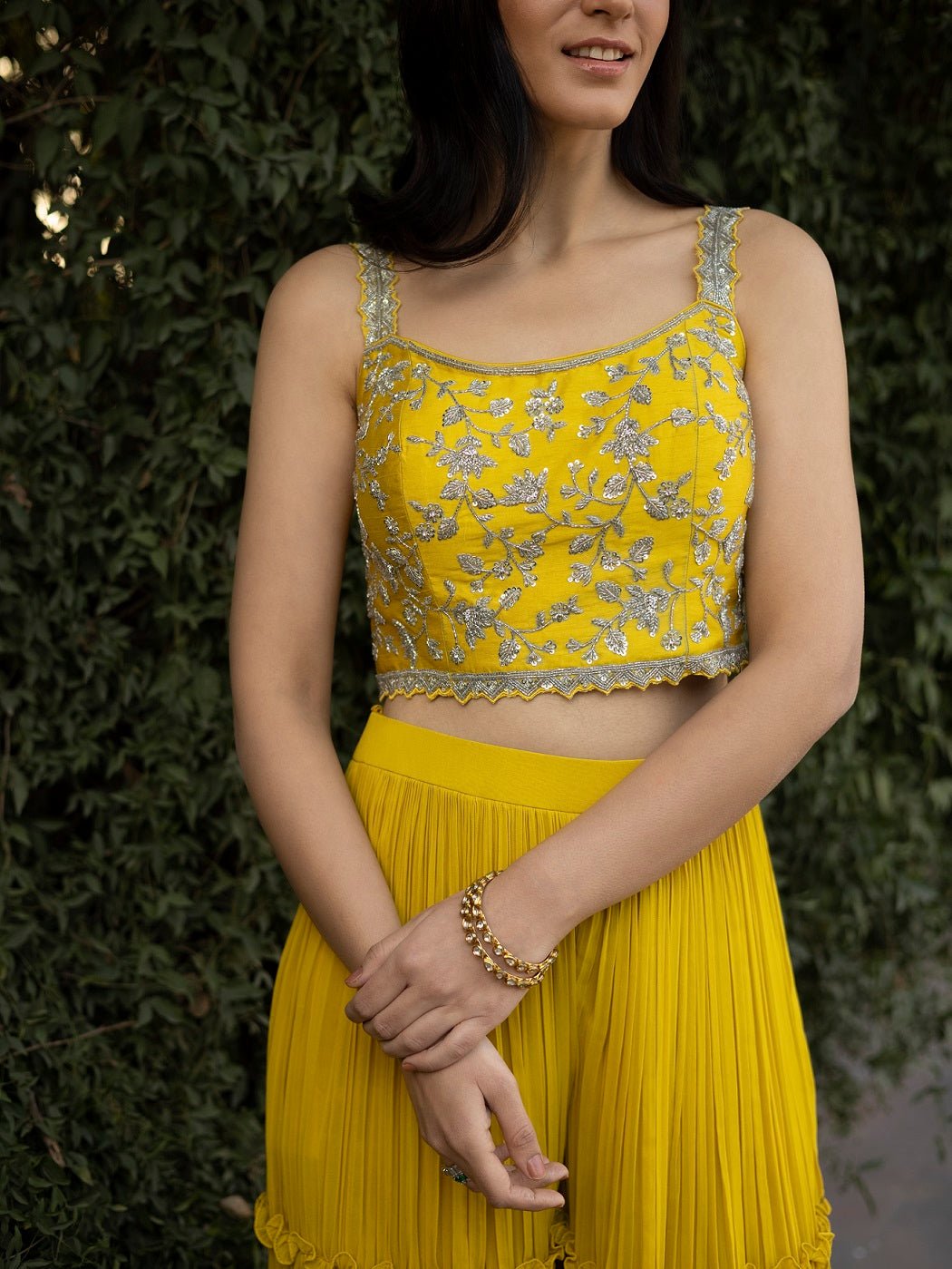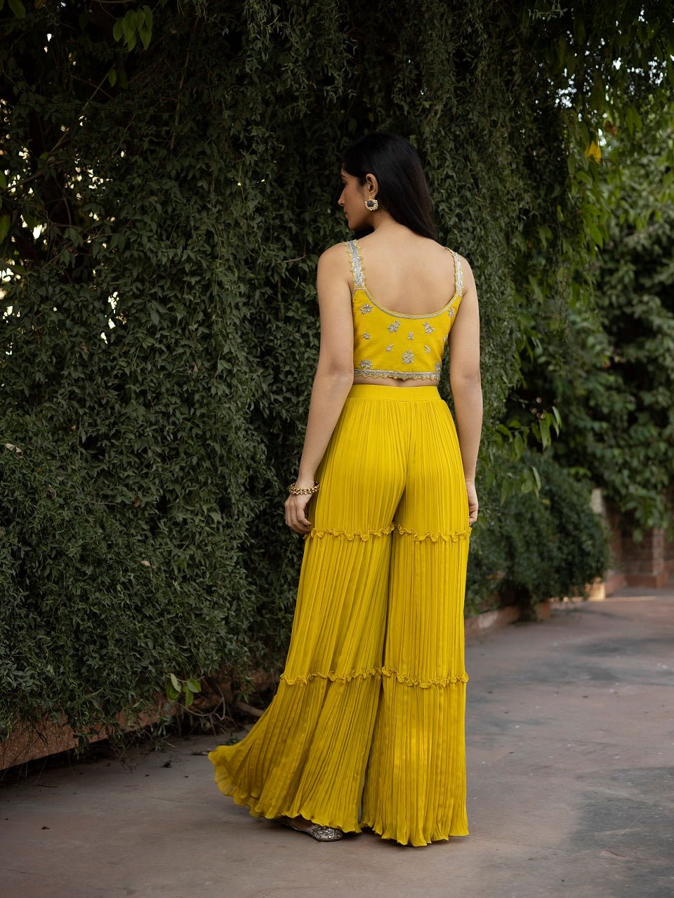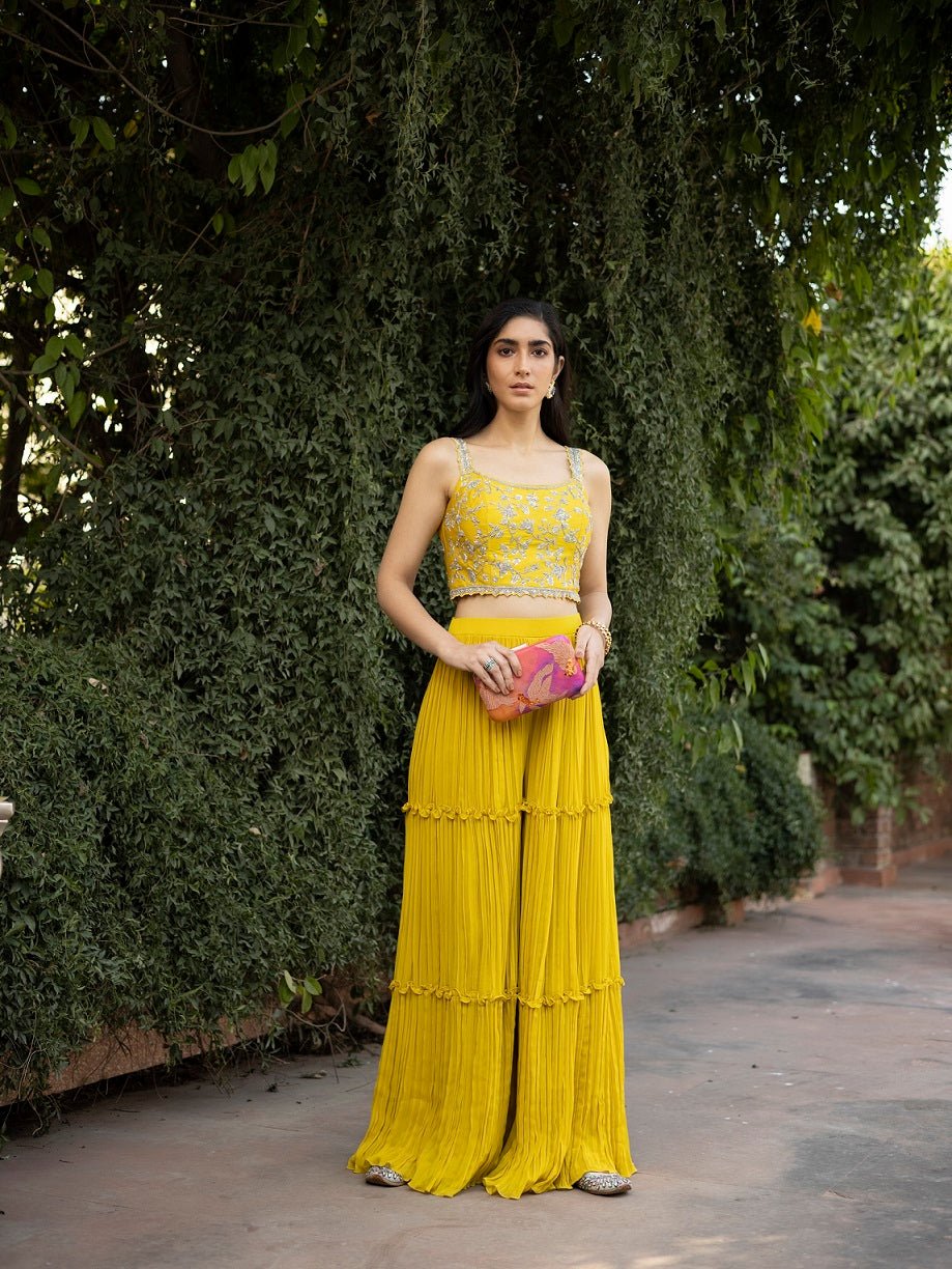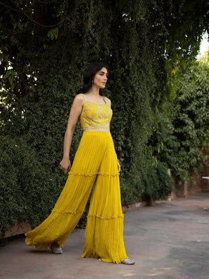 Beautiful corn yellow embroidered pleated layered sharara with bustier. It is perfect for parties and special occasions. Shop online from Pure Elegance.
