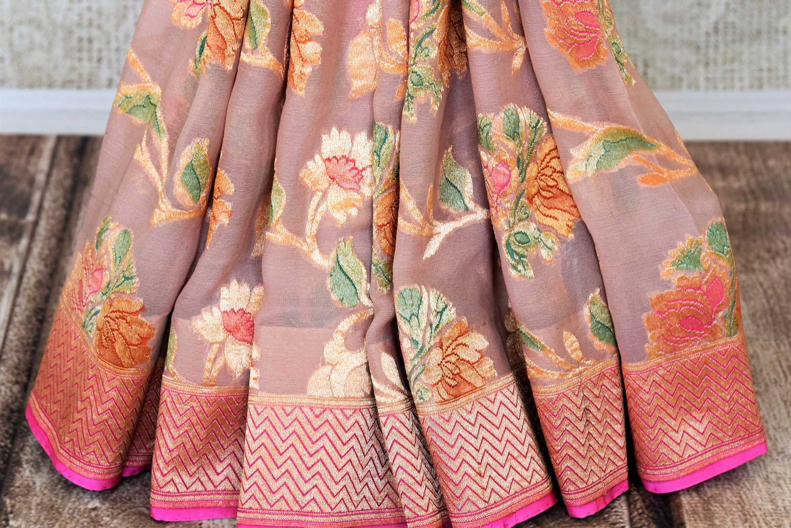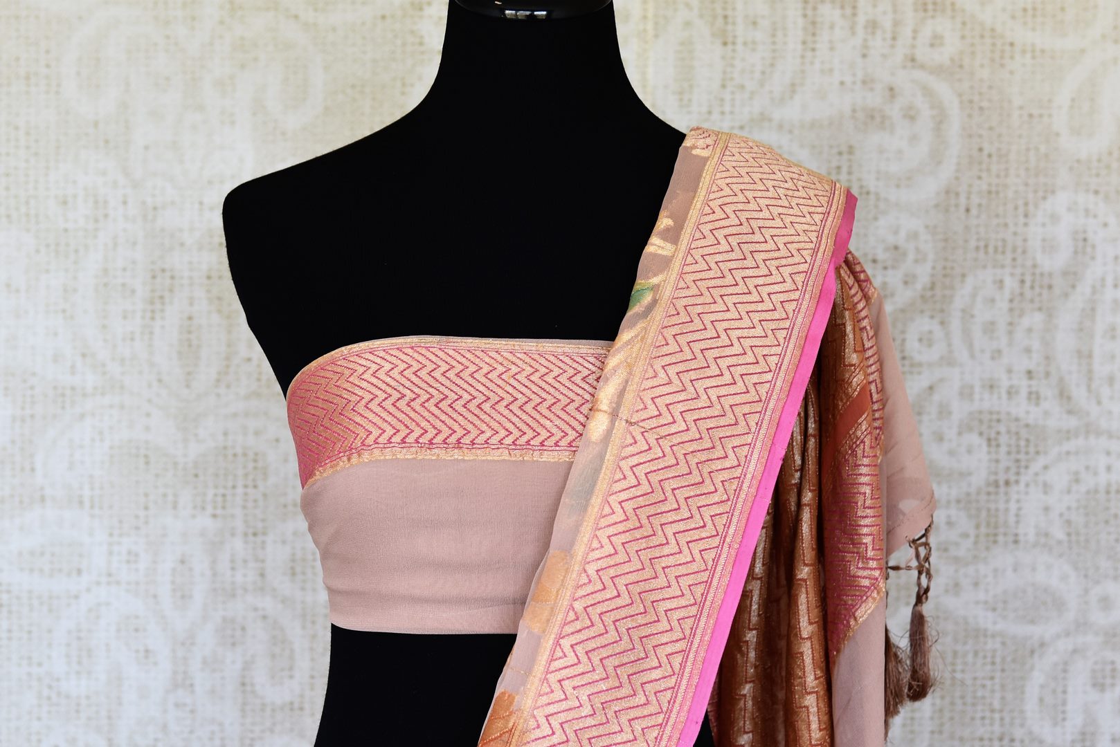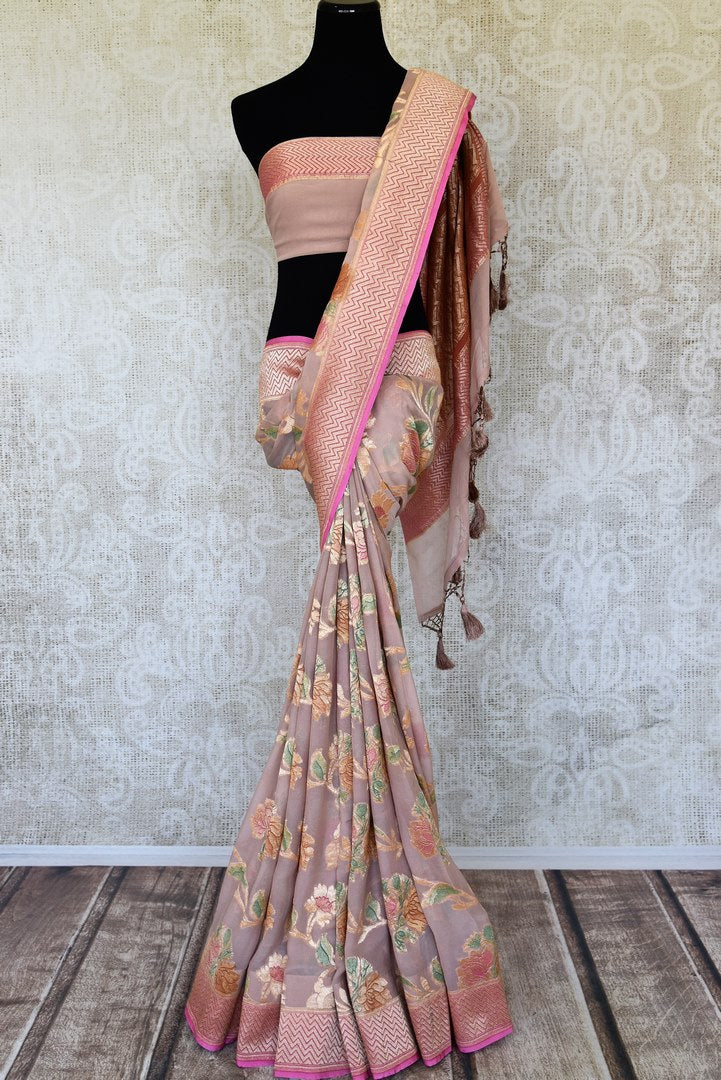 Stunning dusty pink color georgette Benarasi saree for festive occasions! The saree is crafted with zari and minakari floral jaal and a pink chevron zari border and pallu. It comes with a matching blouse piece. Buy online from Pure Elegance or visit our store in USA.