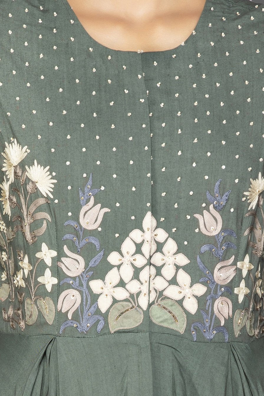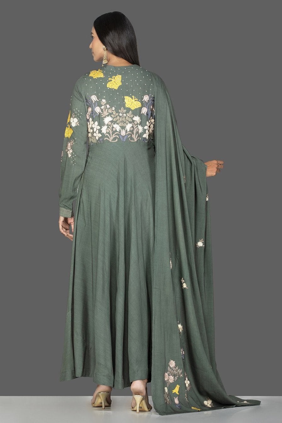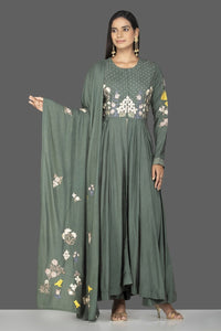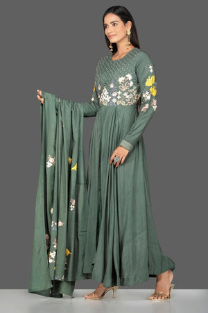 Captivating green modal silk Anarkali with exquisite resham embroidery is perfect for the festive occasions. The suit comes with a matching dupatta. Shop online from Pure Elegance.