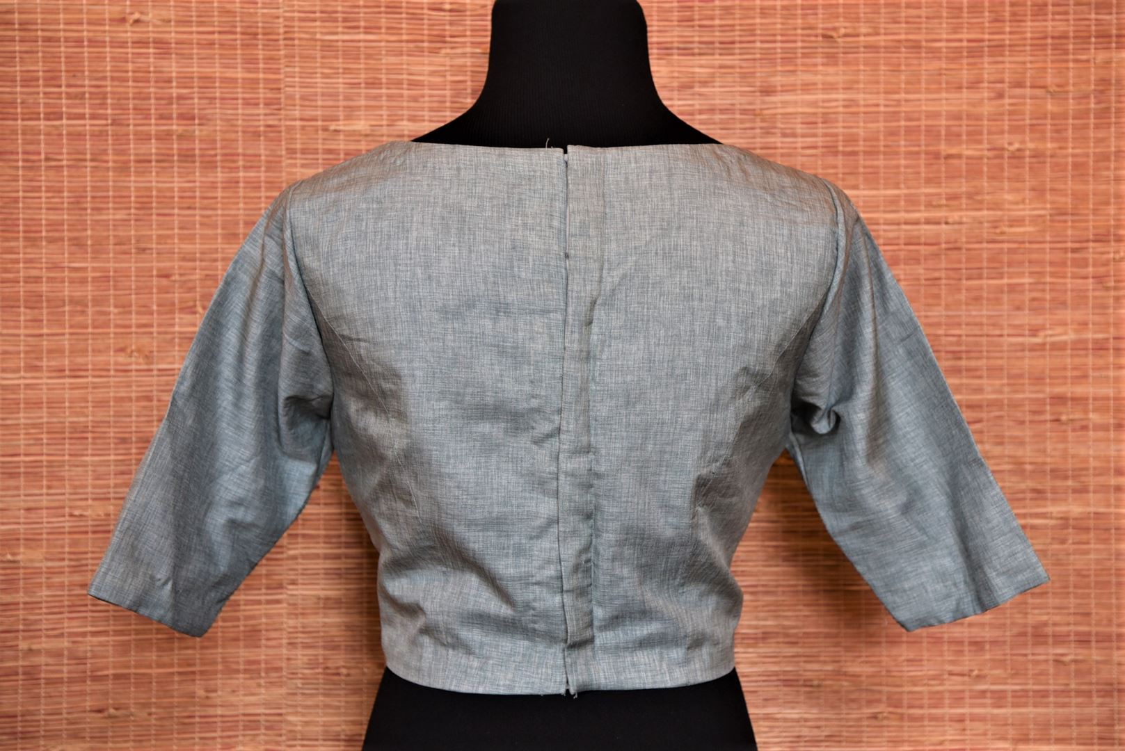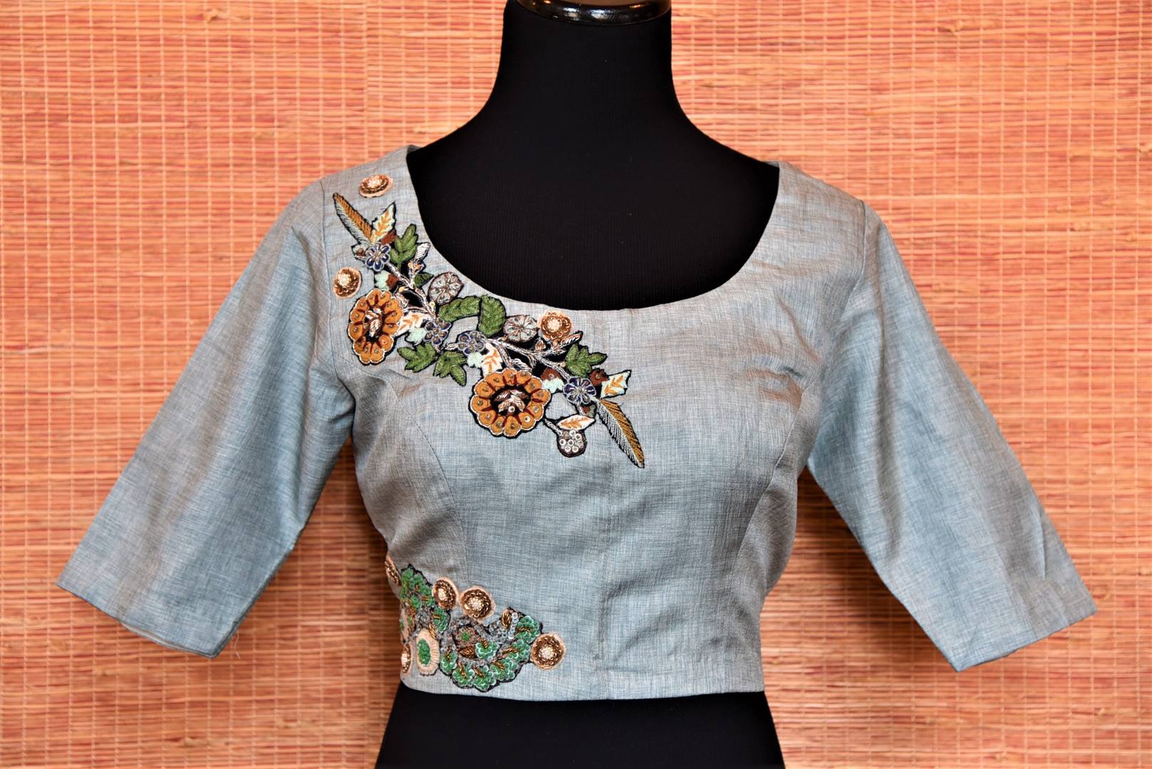 Elegant grey color embroidered raw silk readymade sari blouse. Shop designer saree blouse in USA from Pure Elegance.