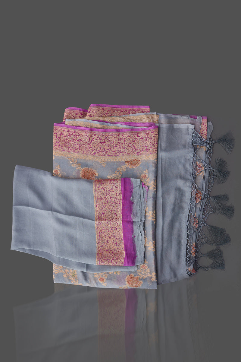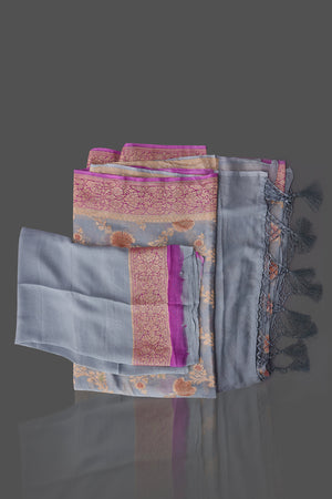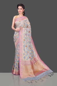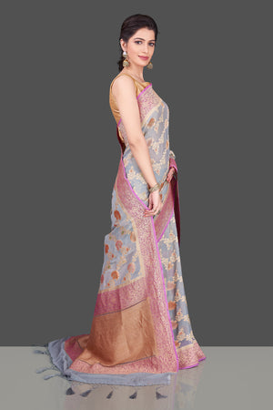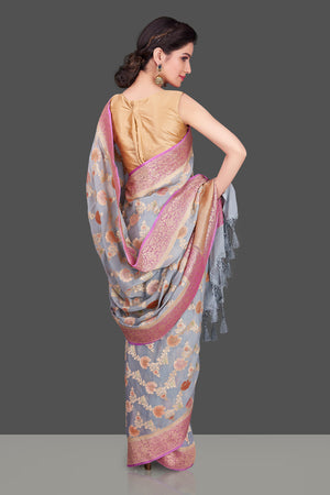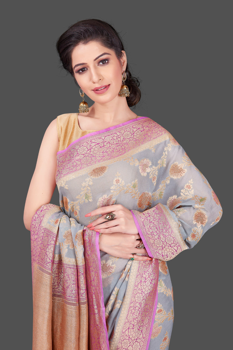 Beautiful light grey georgette Banarasi sari is perfect for daytime weddings and festive occasions! The saree is adorned with pink zari border and pallu and has overall floral zari jaal enhanced with brush dyeing. It comes with a blouse piece. Buy online from Pure elegance.