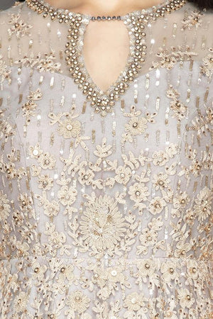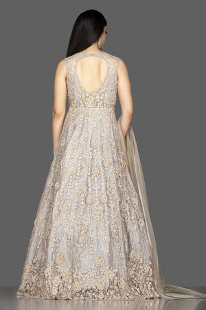 Gorgeous light grey stone and resham embroidery silk Anarkali with dupatta for parties. Shop such stunning designer gowns in USA from Pure Elegance.