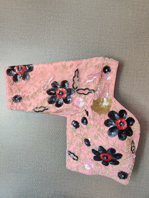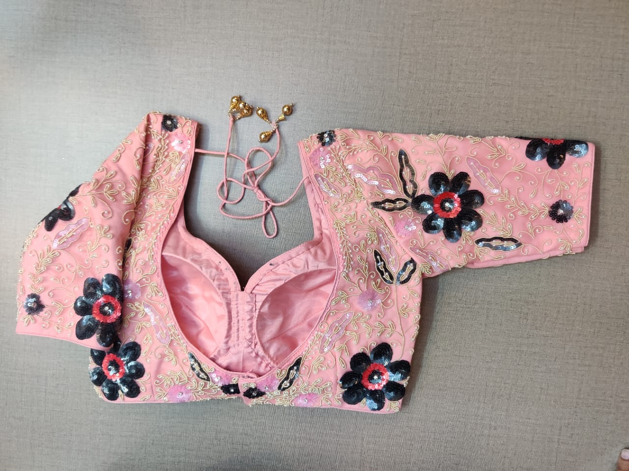 Beautiful light pink designer saree blouse with heavy embroidery. Buy designer blouse in USA from Pure Elegance.