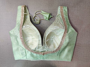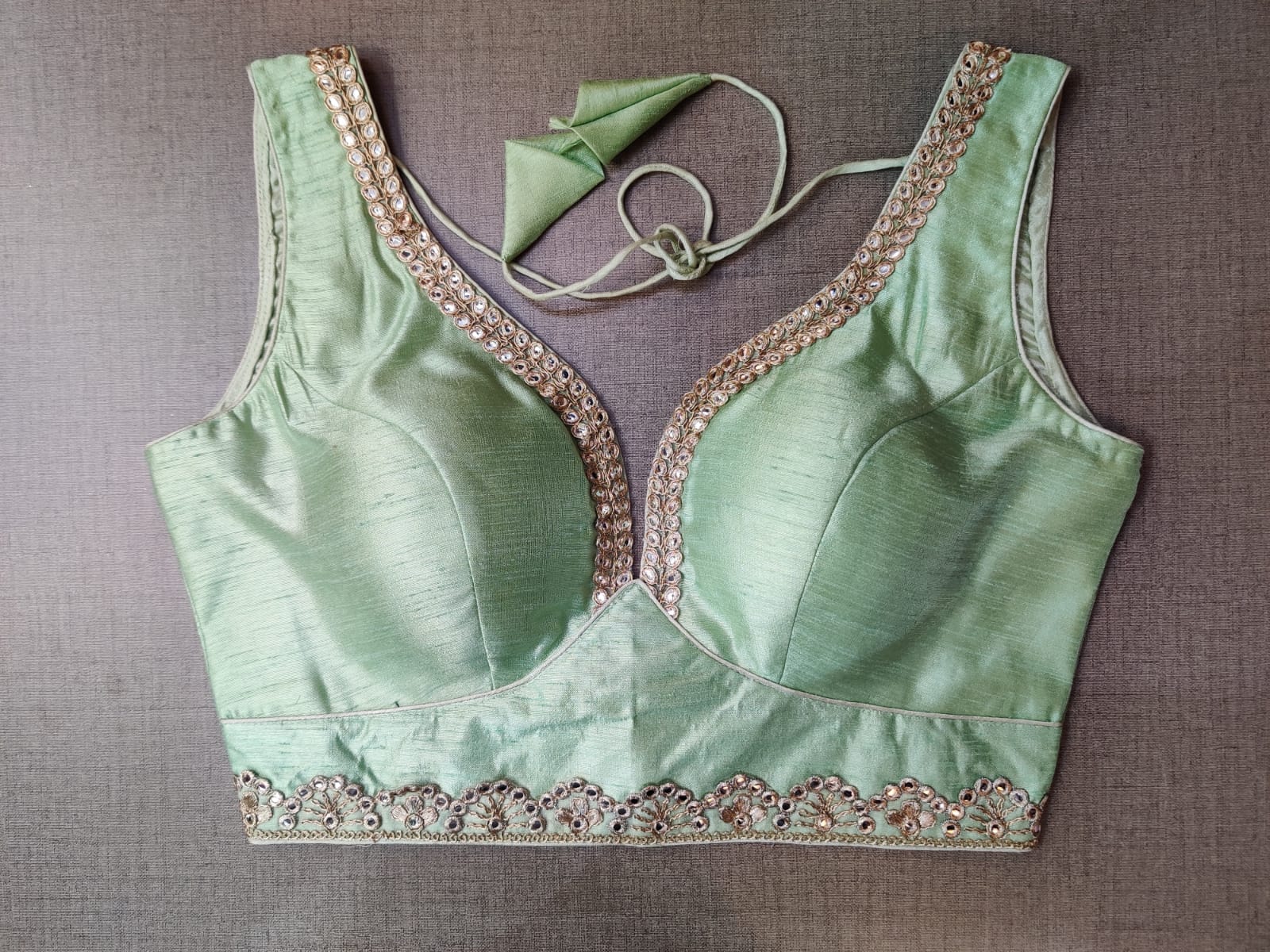 Beautiful mint green sleeveless sari blouse with silver embroidery. Buy designer blouse in USA from Pure Elegance.
