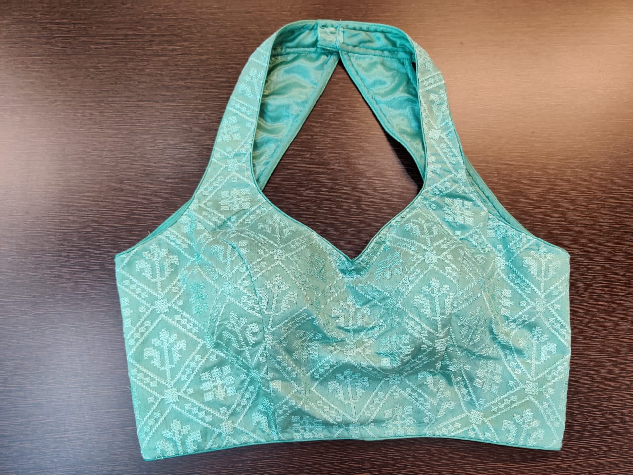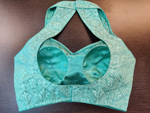 Stunning pastel green halter neck saree blouse. Shop designer saree blouse online in USA from Pure Elegance.