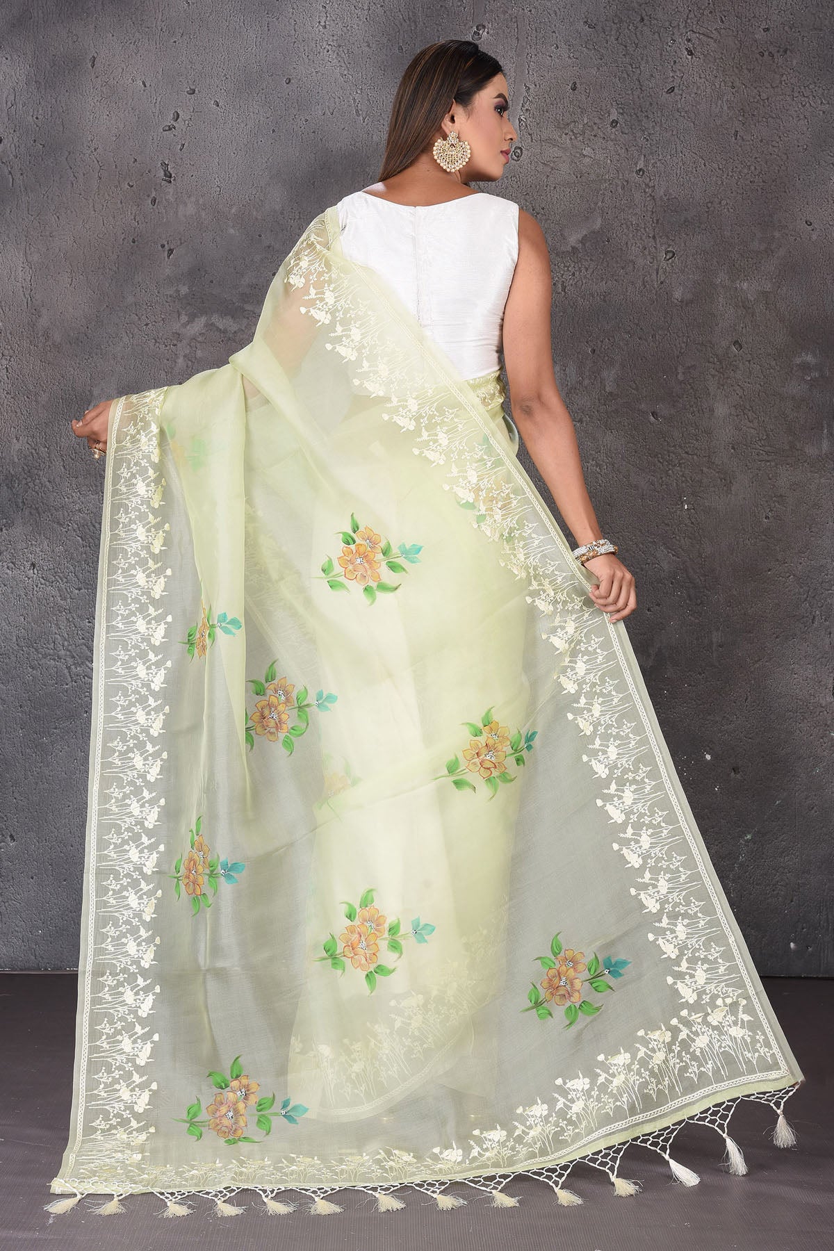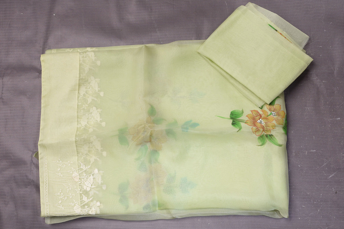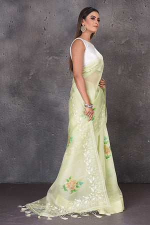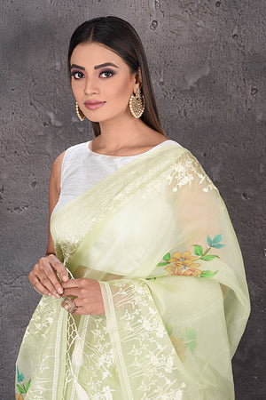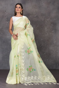 Look your ethnic best on festive occasions in this beautiful pastel green floral organza saree! The saree has an embroidered border. It comes with a matching blouse piece. Shop designer sarees in USA from Pure Elegance.